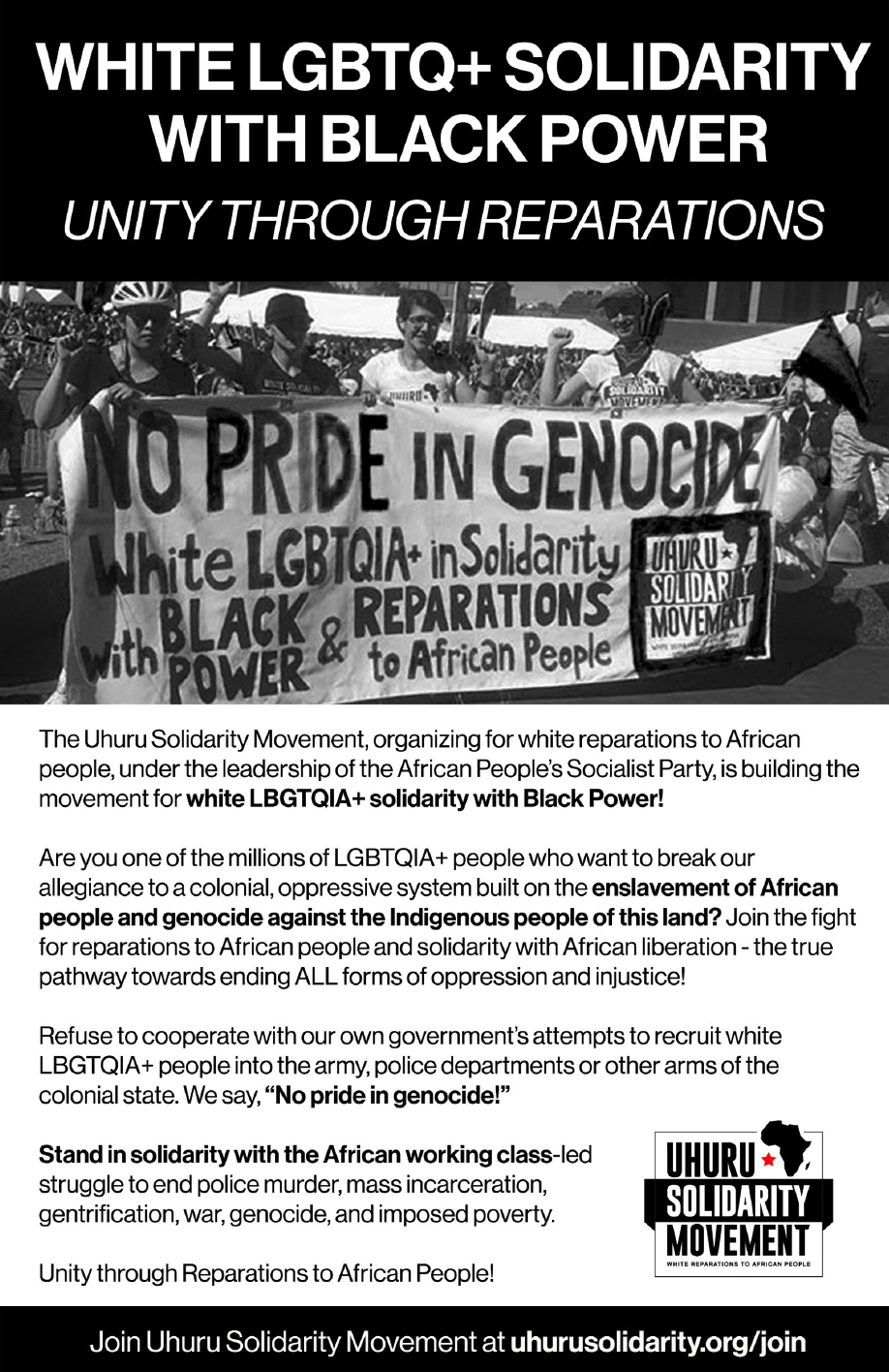 During this week of SF Pride, we call on all white LGBTQ+ to join our meeting to learn more about the work of the Uhuru Solidarity Movement and our local work in the San Francisco Bay Area to build a movement of white peoples' reparations to the African / Black community.