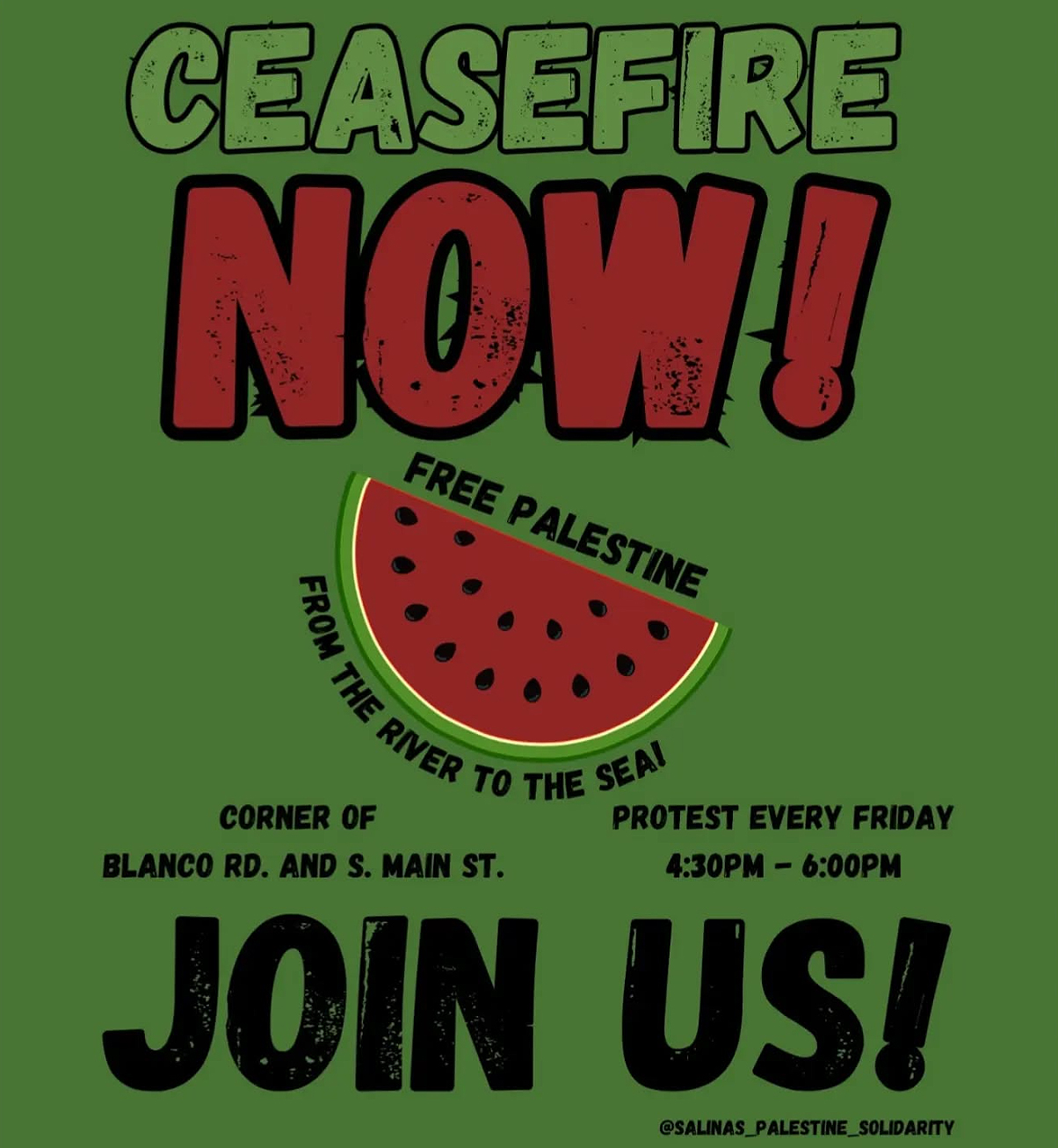 Nearly two years strong on the second busiest intersection in Salinas. SPS calls attention to the ongoing genocide in Gaza and the USA support for the crime of all crimes. Come join us every Friday, rain or shine.