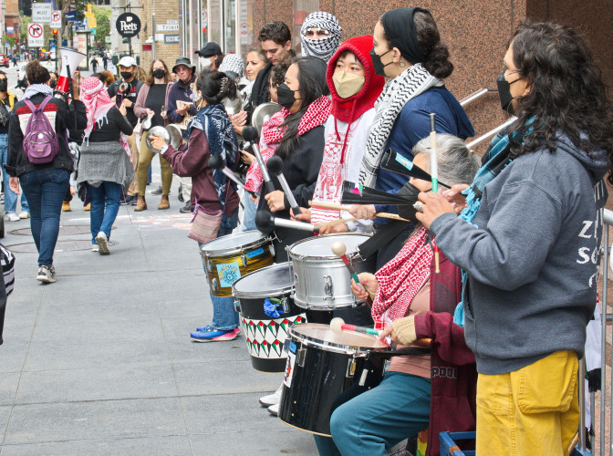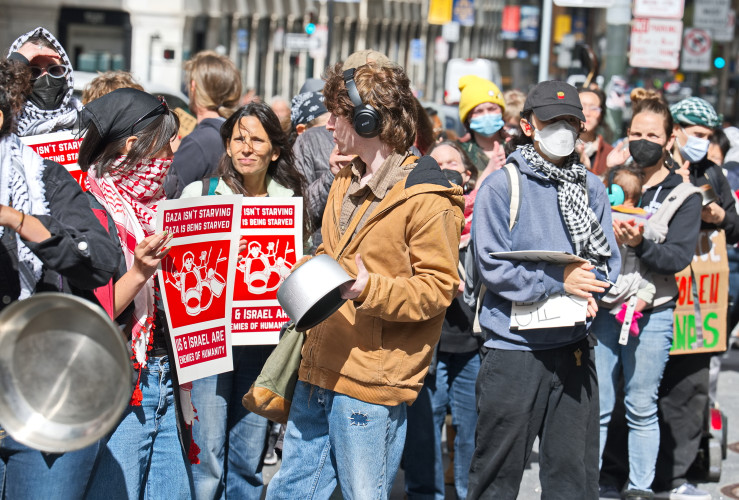 (San Francisco, July 25) – The French call it a “caserolade,” a casseroling, but it’s not about food, its about their other great love, political protest. Along with pounding drums, hundreds of people brought pots and pans and metal cooking utensils and they made a lot of noise. It would be hard to believe that anyone in the large office building at 333 Bush St. did not notice. Perhaps some office tenants might find the regular disturbances a problem and suggest that Senator Padilla go elsewhere. Antarctica comes to mind.Unlike in many popular protests, very few people were smiling here. They were angry. Seeing the photos coming from Gaza of parents holding starving children with sticks for arms and legs reminded many older Bay Area people of the images they had seen of the Nazi Holocaust.