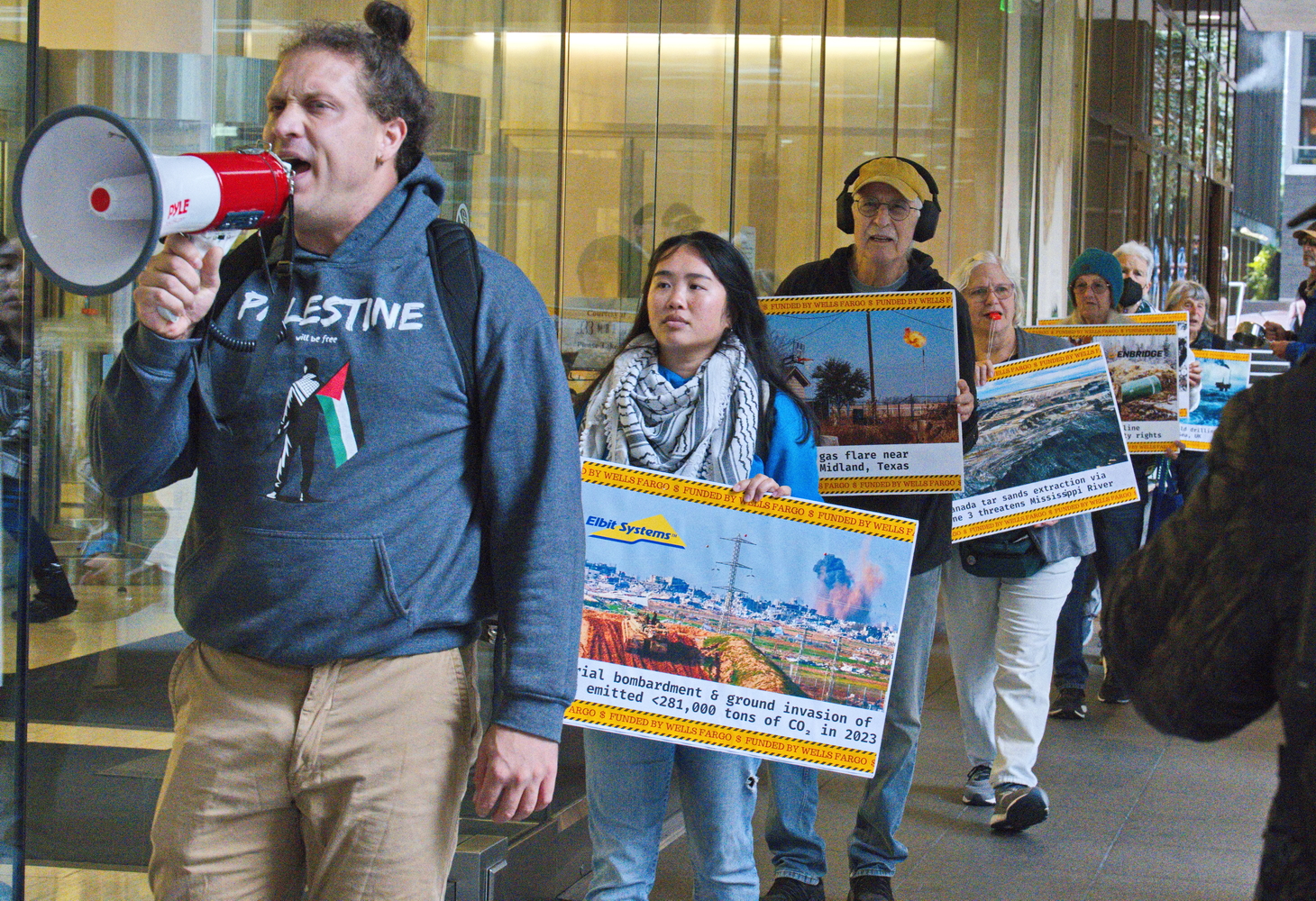Carrying signs documenting Wells Fargo’s crimes. The protesters marched around the bank and in the building’s front plaza.