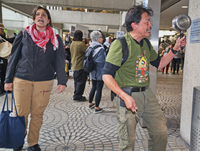 (San Francisco, July 30) - Two Embarcadero Plaza reverberated with the din of clanging pots and pans as protesters marched through the halls of the bottom floor and called out BCG's complicity in the Palestinian genocide.They drew an image of a starving child and "bloody" hand prints on the ground driving home the point.