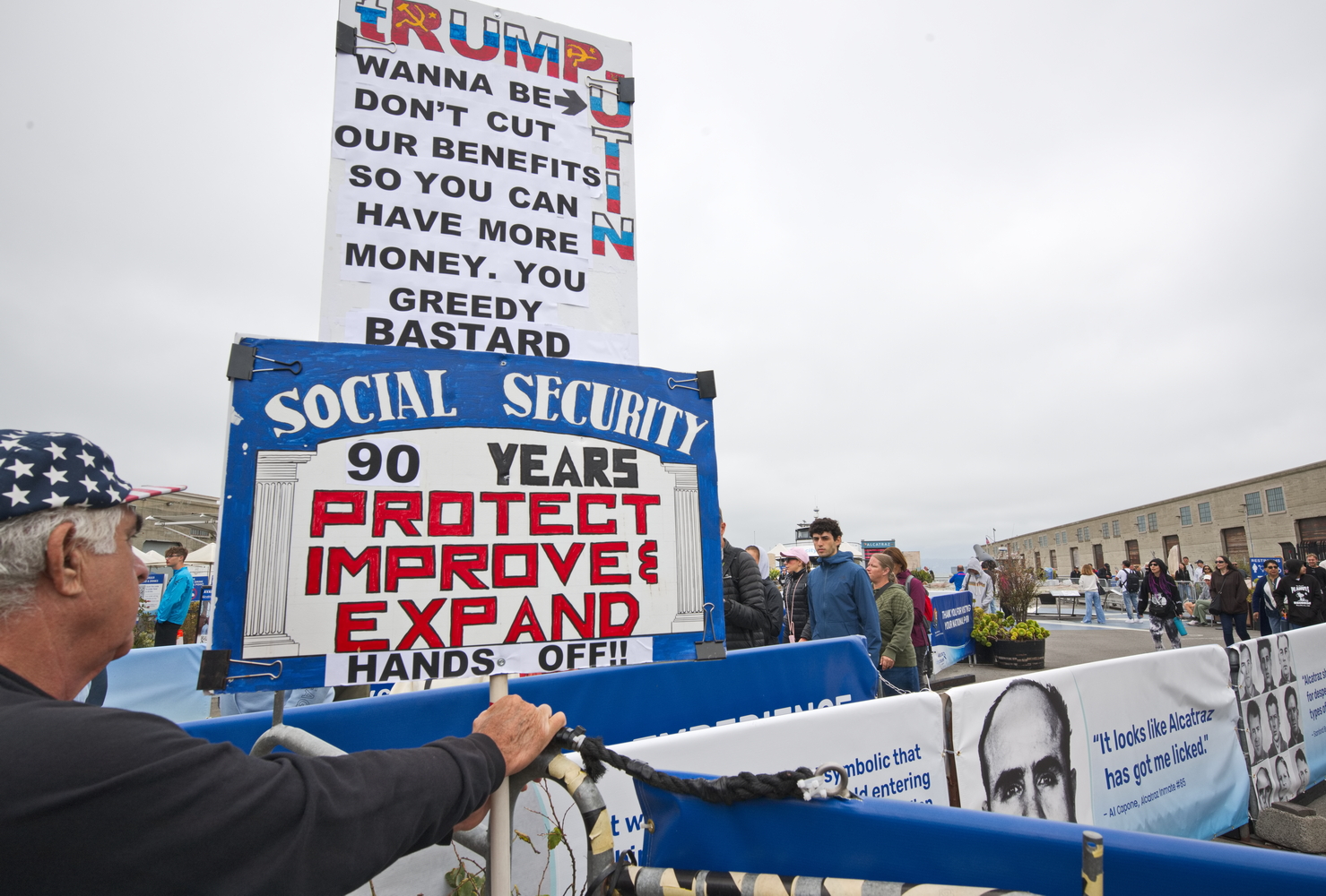 (San Francisco, July 31) Tourists visiting Alcatraz were reminded that Medicare and Medicaid, the bedrock of the nation's health care system are under threat.As the country's democratic institutions erode with a president getting hundreds of millions of dollars in bribes from a for-profit health care industry, speakers called out the threat. They vowed to resist.