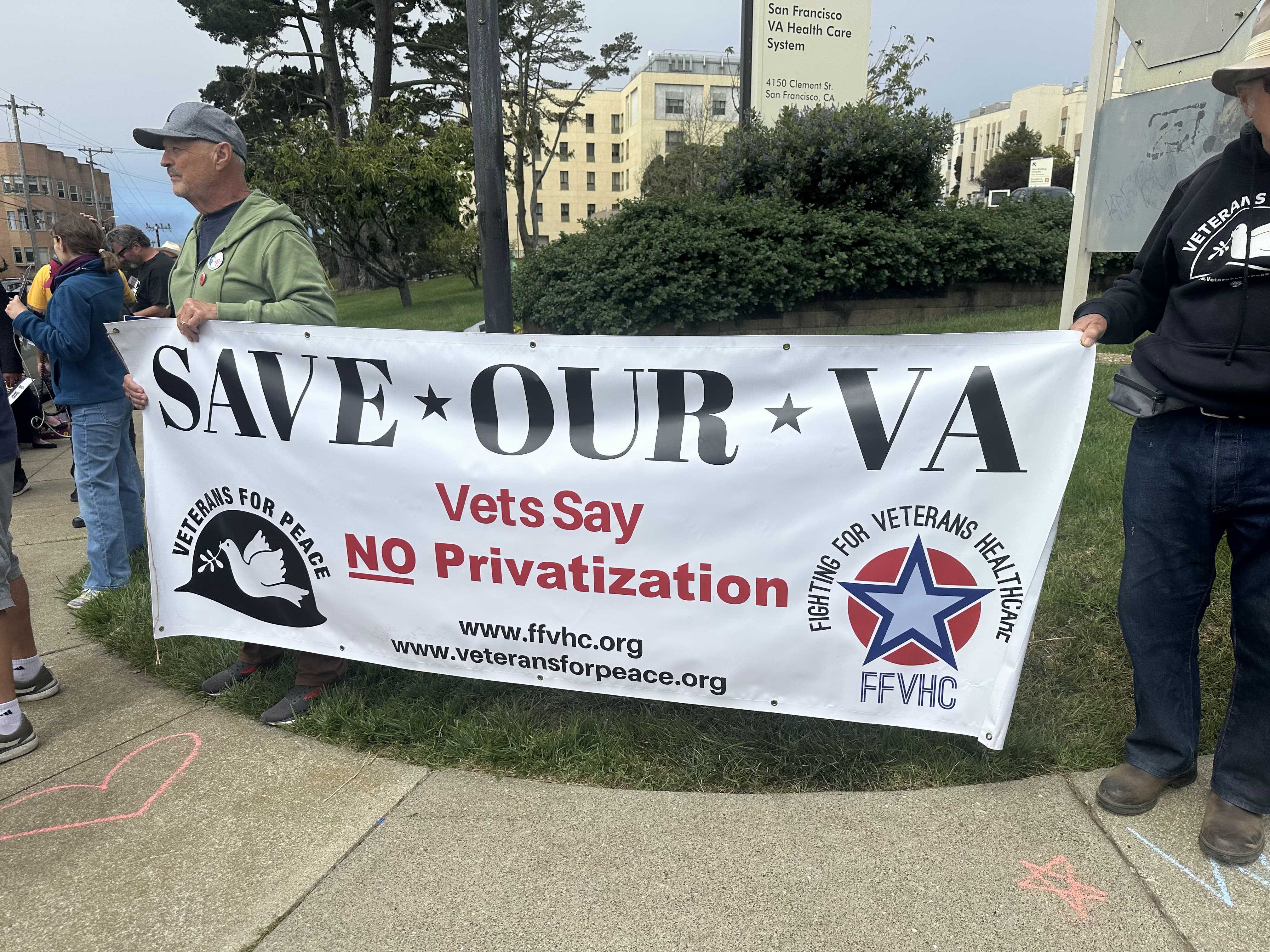 Workers, veterans and supporters of the VA rallied at the San Francisco VA on August 15, 2025. They called a halt to the union busting and privatization drive by Trump