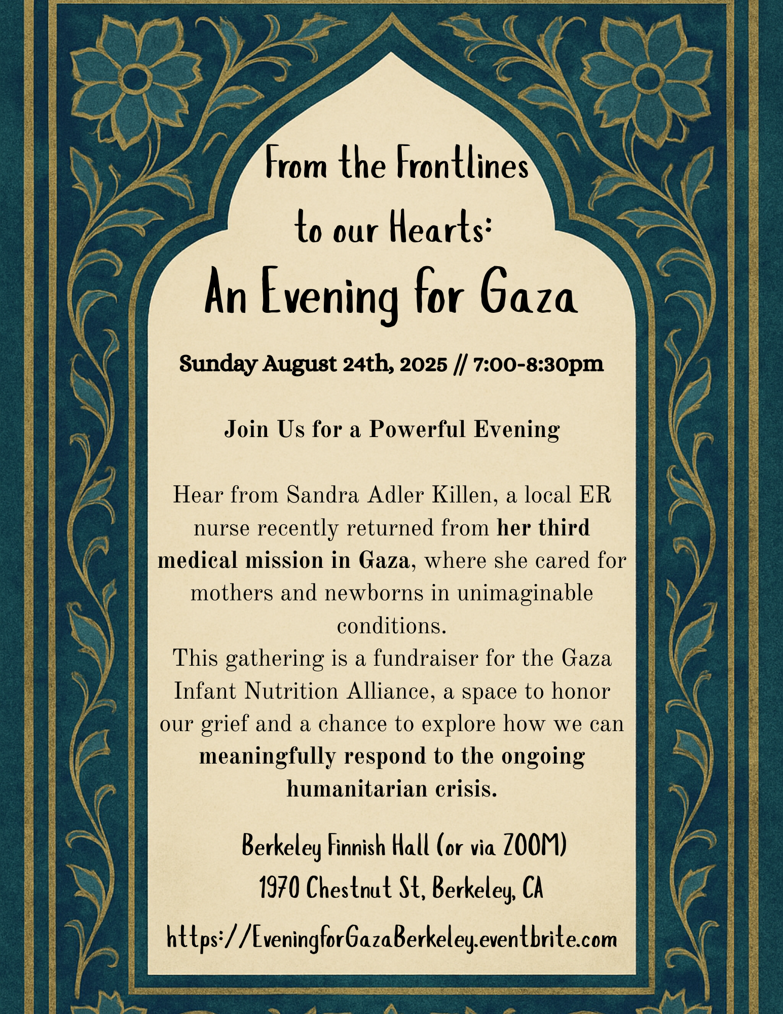 This evening also serves as a fundraiser for the Gaza Infant Nutrition Alliance, directly supporting mothers and babies in Gaza.
