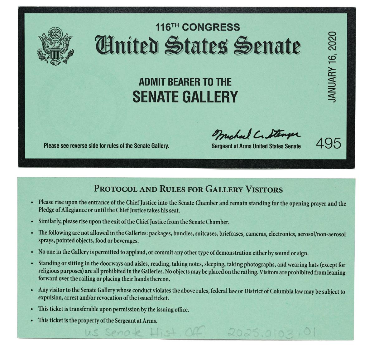 The above green ticket, is a Ticket to Donald J. Trump’s 2021 Senate impeachment trial (front and reverse)