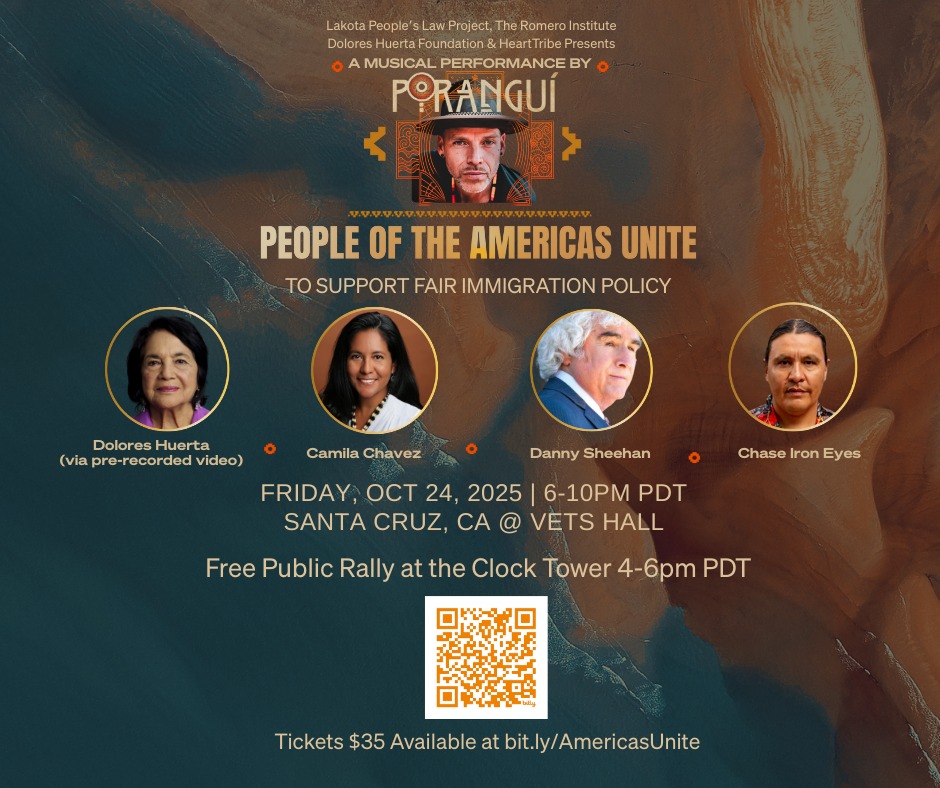 Featured speakers include Dolores Huerta (via pre-recorded video, co-founder of the United Farmworkers Union), Camila Chavez (executive director of the Delores Huerta Foundation, daughter of Dolores Huerta, and niece of Cesar Chavez), Daniel Sheehan (Chief Counsel of the Romero Institute), and Chase Iron Eyes (Executive Director of the Lakota People’s Law Project). To close the evening, renowned Brazilian musician Poranguí will share his powerful music.
