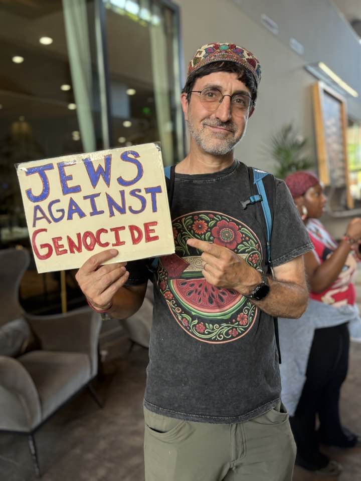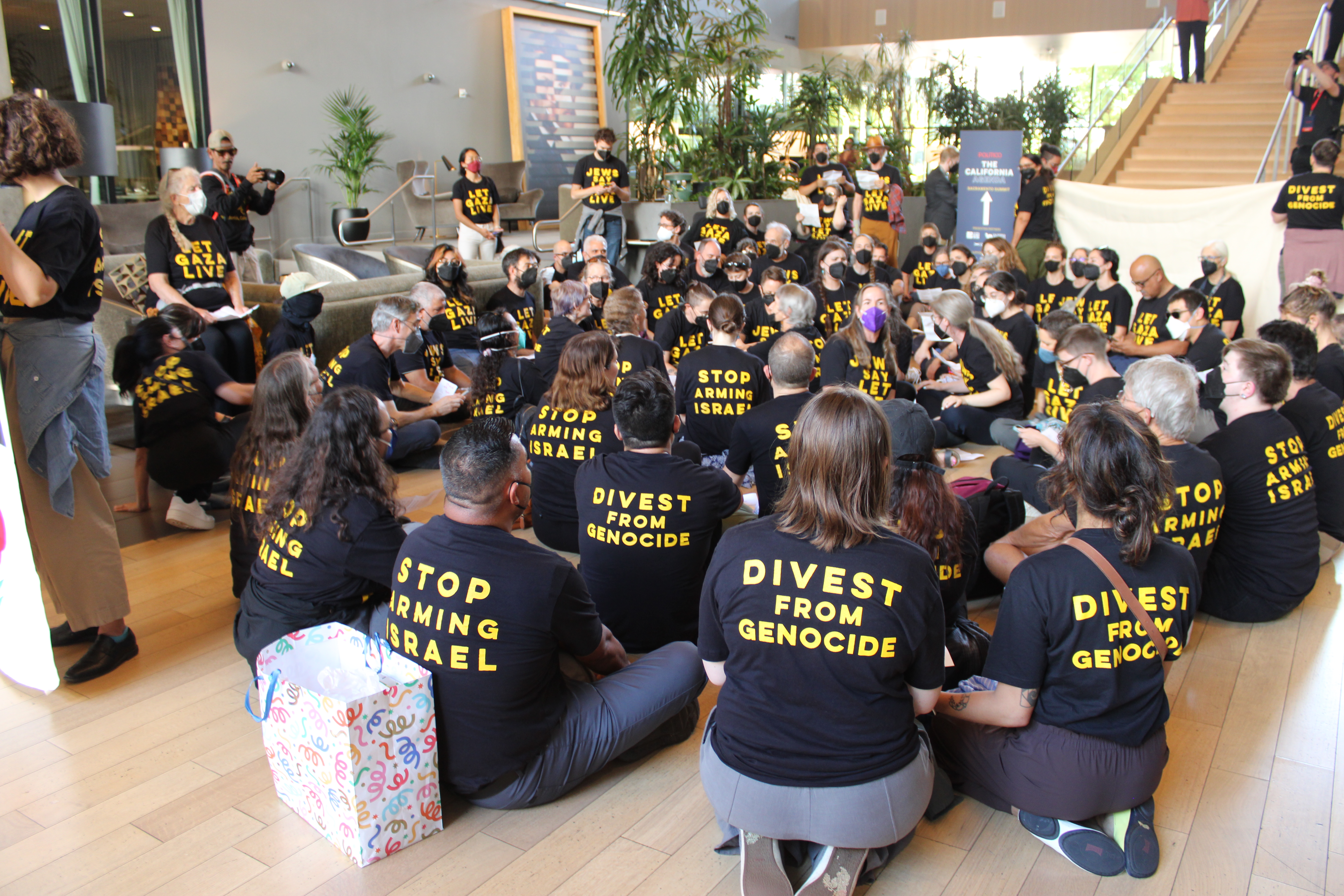 Sacramento, CA (August 27) — As they chanted and sang, over 100 members of Jewish Voice for Peace Sacramento and their allies staged a dramatic sit-in in the lobby of Kimpton Sawyer Hotel in downtown Sacramento as U.S. Senator Alex Padilla participated as a "featured guest" in Politico’s corporate funded inaugural California policy summit.