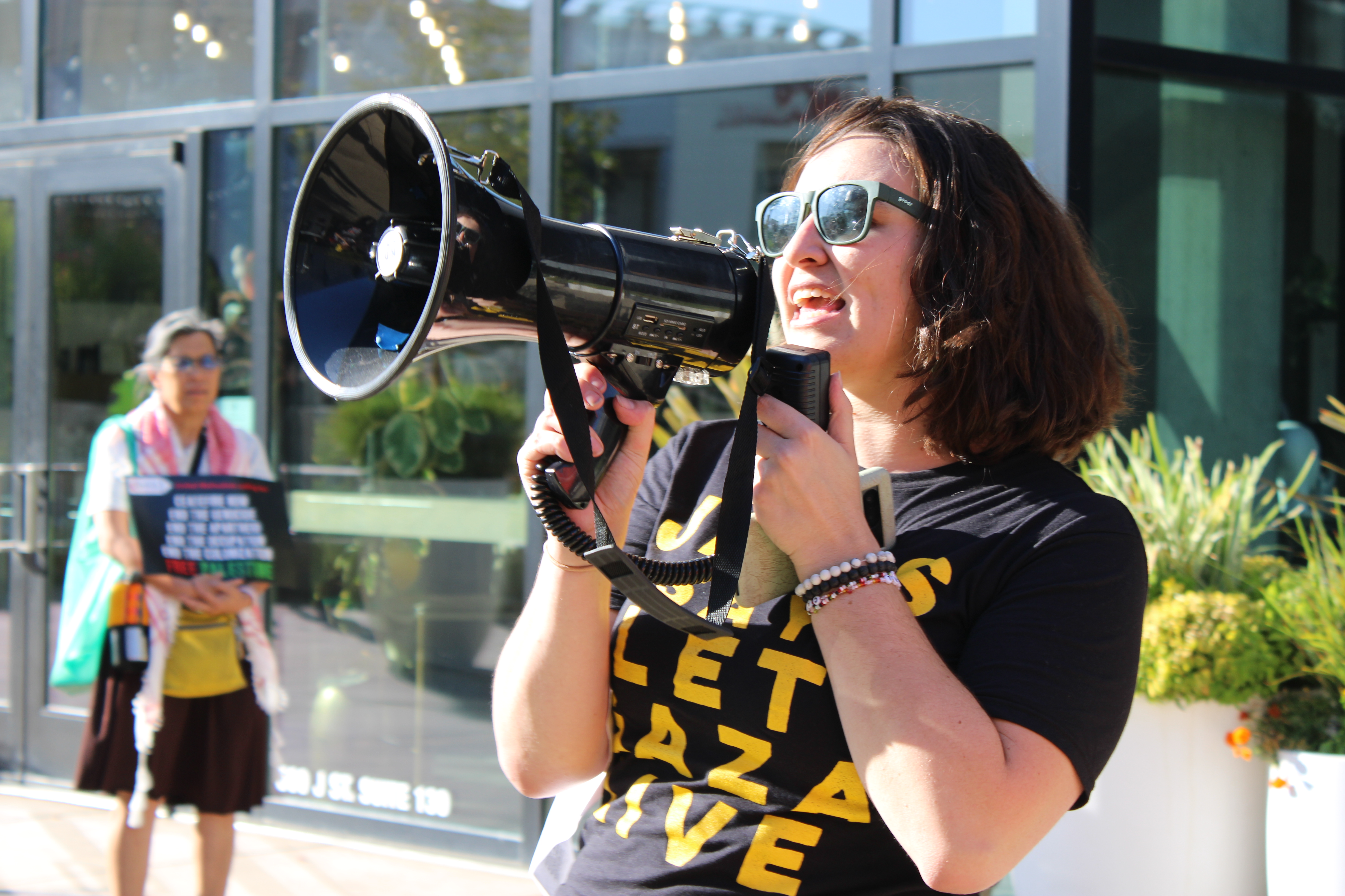 The sit-in was followed by a public rally in DOCO Plaza outside of the hotel from 4:30-6 pm for community members to join and demand that Senators Padilla and Schiff take immediate action to stop the genocide. Organizers again led the group in a series of chants and songs.