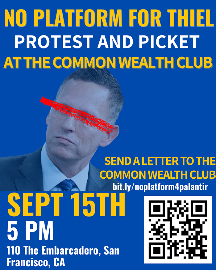 The Commonwealth Club is hosting a 4-part event series this month with billionaire tech-oligarch Peter Thiel. Thiel is the founder of Palantir, the company that is literally providing the data for mass public surveillance of our communities, the violent ICE kidnapping of immigrants, the genocide in Gaza, union-busting efforts and more. His lecture series is on the topic of the Anti Christ - which is a little on-the-nose given his life’s work, yet he suggests (seriously!) that selfless activist Greta Thunberg might actually be the anti-christ we should fear.