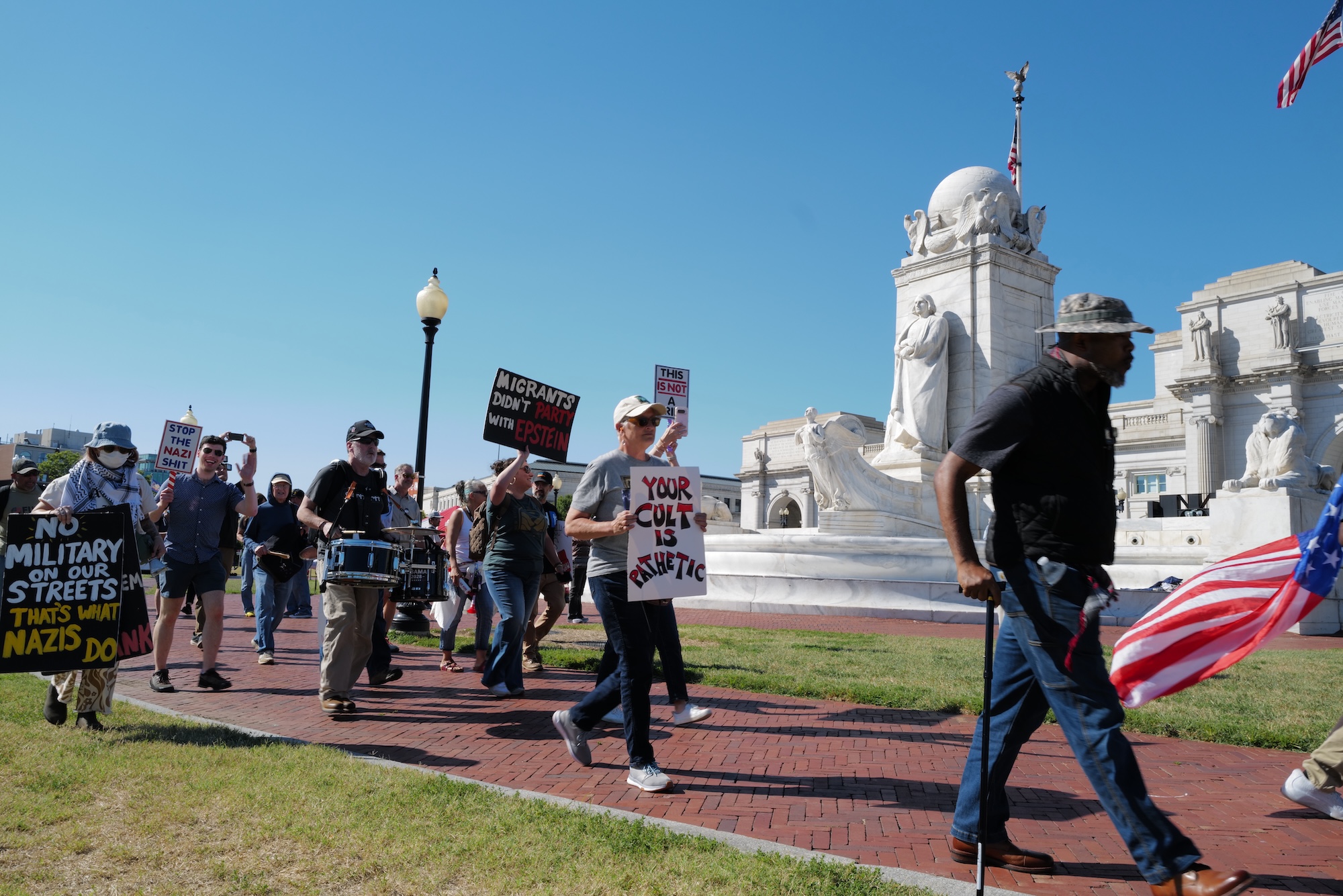 Both activist groups have vowed not to let the Trump administration push the Project 2025 policy agenda quietly. Their mission is to draw attention to the Heritage Foundation headquarters and its authors, by making lots of loud noise, music, and chanting while holding signs and banners. After a noisy short march from their combined encampment at Union Station, the group arrived at the Foundation’s building where DC METRO Police were standing by as protesters began their loud cacophony, combined with hurtling invectives through bullhorns aimed at the headquarter building’s stone-cold façade. The only response after being called “fascists and nazis” and worse was that someone within the hallowed halls closed the blinds in an upper story window facing the boisterous crowd. Merely closing the blinds will not deter the anger many Americans are feeling about Project 2025’s implementation or reduce the message into the ears of those in the building from the protesters below.