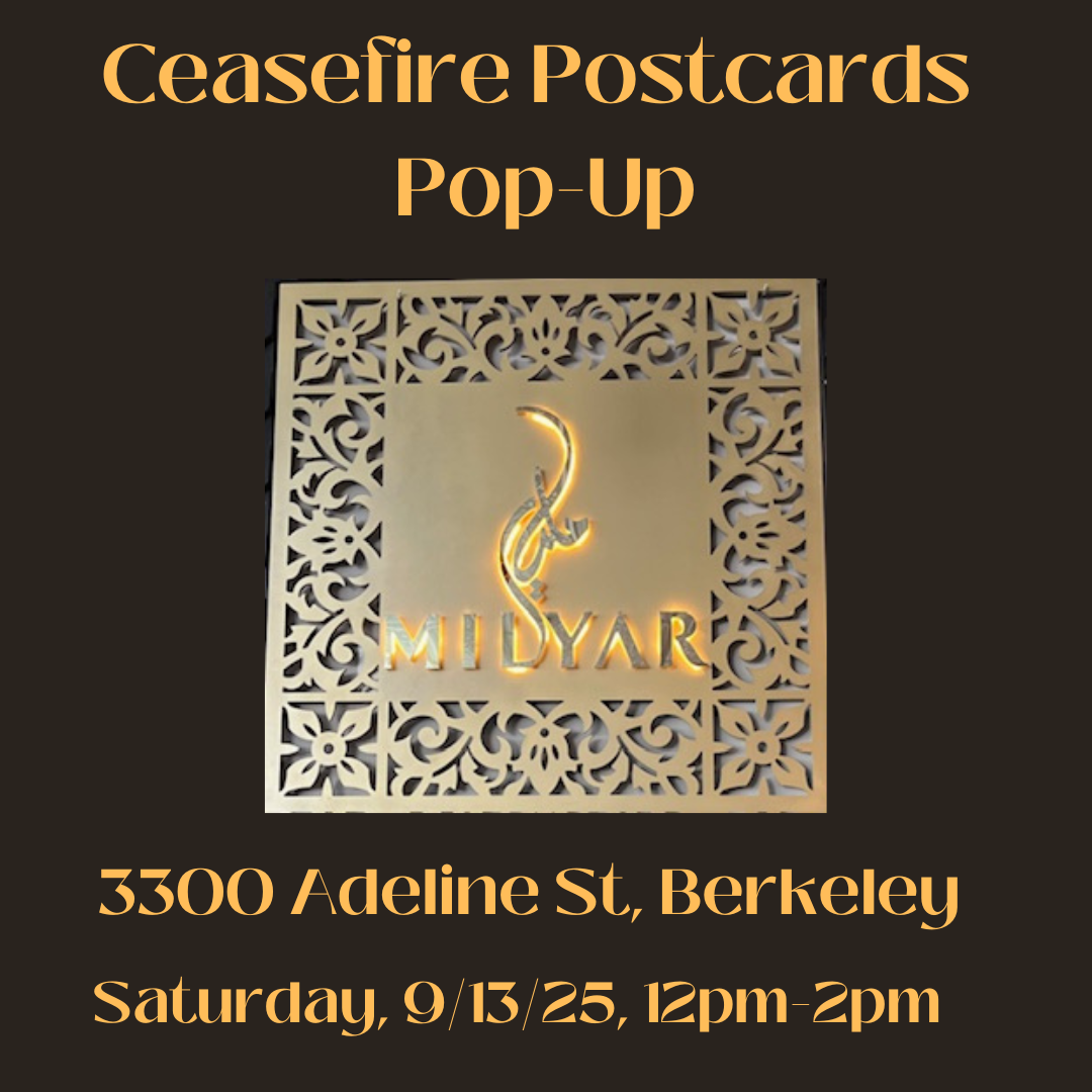 This Saturday, September 13th, from 12pm to 2pm, we will meet at Milyar Cafe, located at 3300 Adeline St in Berkeley, to continue raising our voices in support of the Palestinian people against the ongoing genocide.