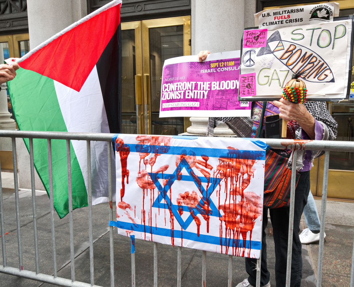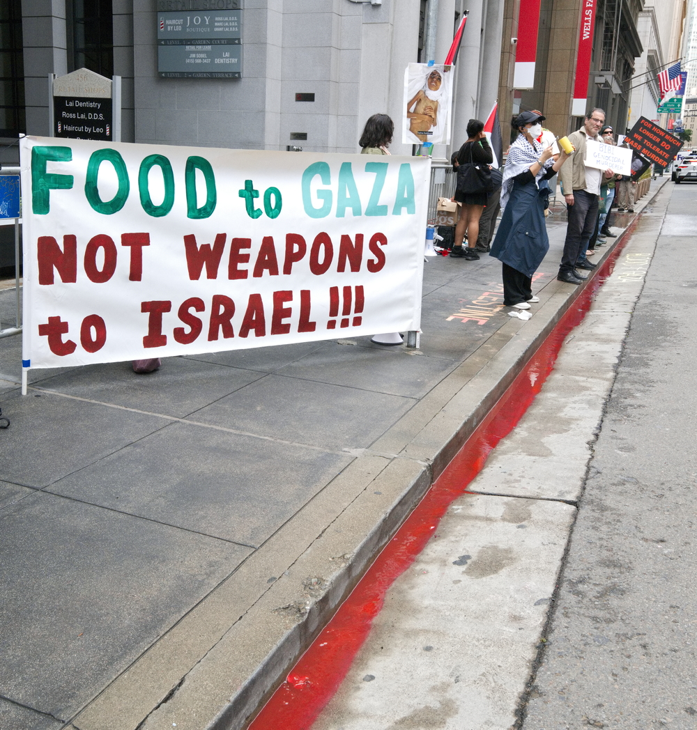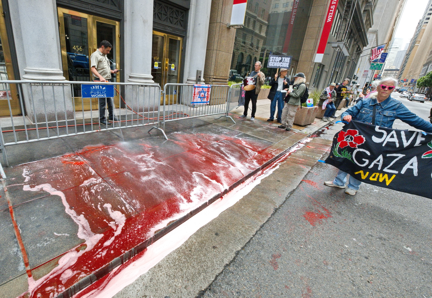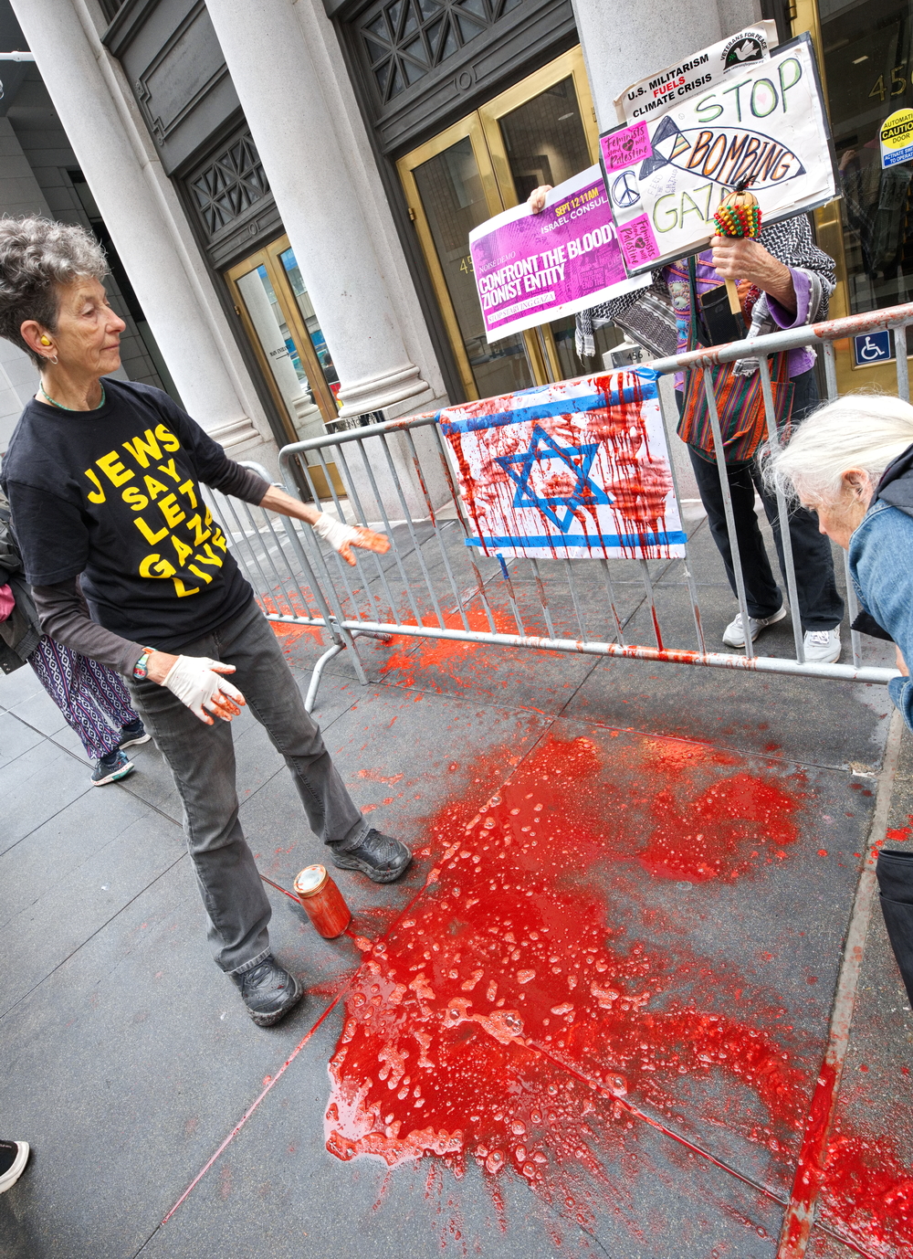(San Francisco, Sept. 12) - When the Israeli Consul in San Francisco decided that red 'blood' in the street resulting from any demonstration should be hosed away, he was probably not counting on the symbolism of 'blood' flowing in the gutter in front of the Israeli consulate. The 'blood' flowed into the gutter as protesters drummed, banged on pots and pans, and blew horns. Others made bloody hand prints on an Israeli flag to protest the ongoing massacre by American bombs and starvation. Some held photos of skeletal starving children.As Netanyahu escalates his final solution for Palestine, the Trump-AIPAC campaign to use antisemitism, the hundreds year old scourge of Jews, to justify a Hilterian genocide, the absurd hypocrisy of the smearing continues.