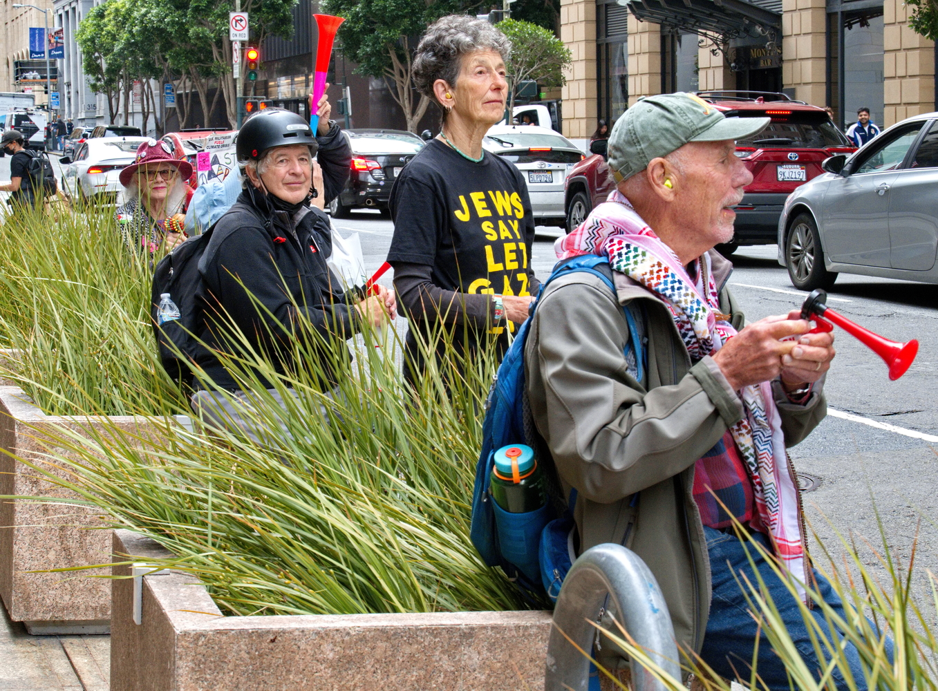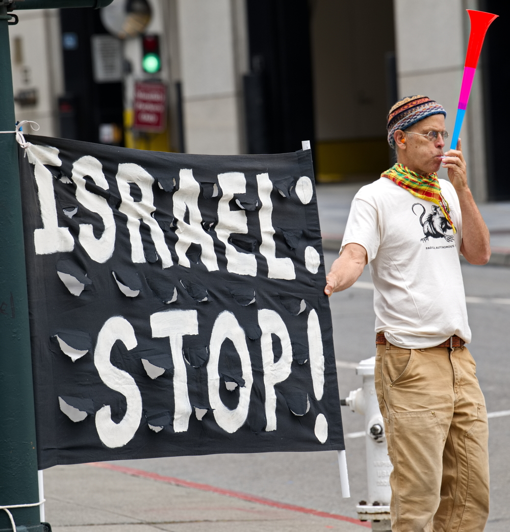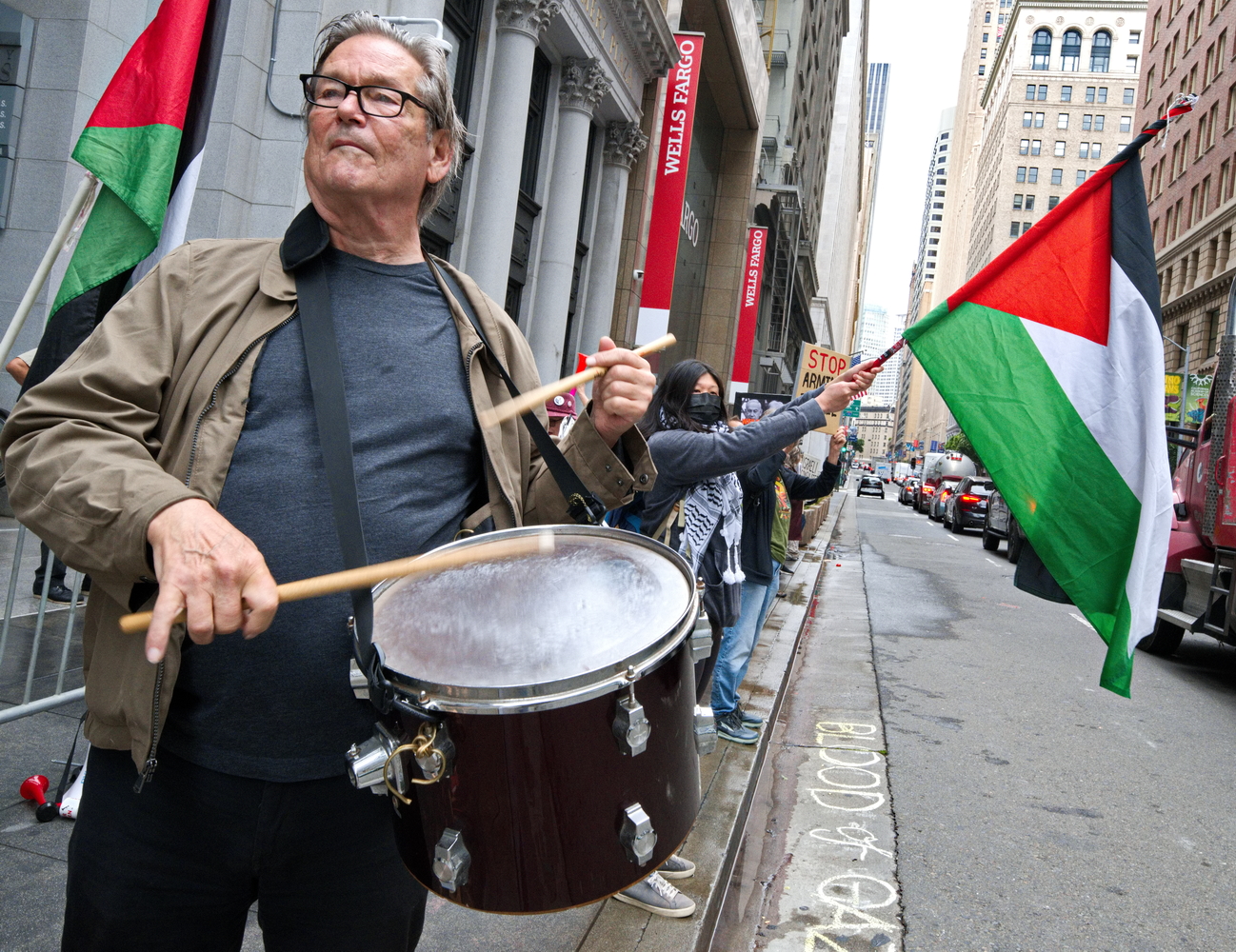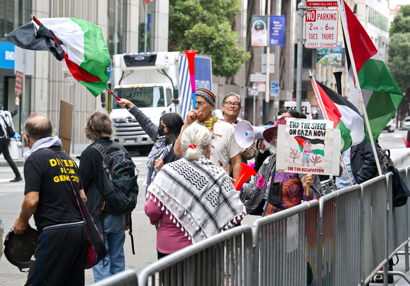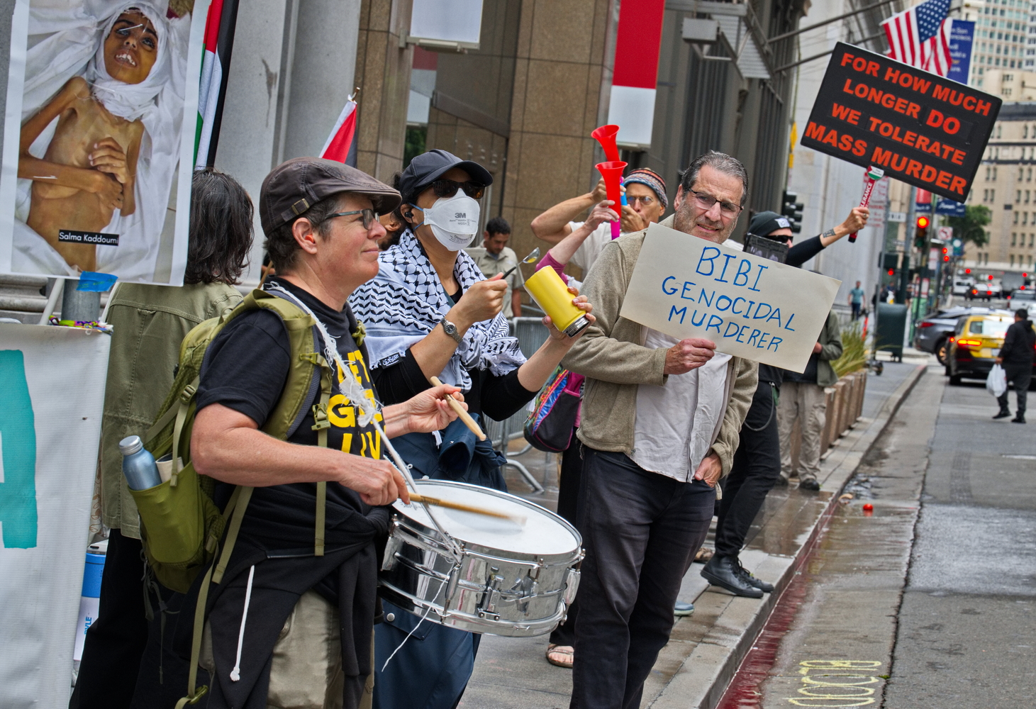 (San Francisco, Sept. 12) - When the Israeli Consul in San Francisco decided that red 'blood' in the street resulting from any demonstration should be hosed away, he was probably not counting on the symbolism of 'blood' flowing in the gutter in front of the Israeli consulate. The 'blood' flowed into the gutter as protesters drummed, banged on pots and pans, and blew horns. Others made bloody hand prints on an Israeli flag to protest the ongoing massacre by American bombs and starvation. Some held photos of skeletal starving children.As Netanyahu escalates his final solution for Palestine, the Trump-AIPAC campaign to use antisemitism, the hundreds year old scourge of Jews, to justify a Hilterian genocide, the absurd hypocrisy of the smearing continues.