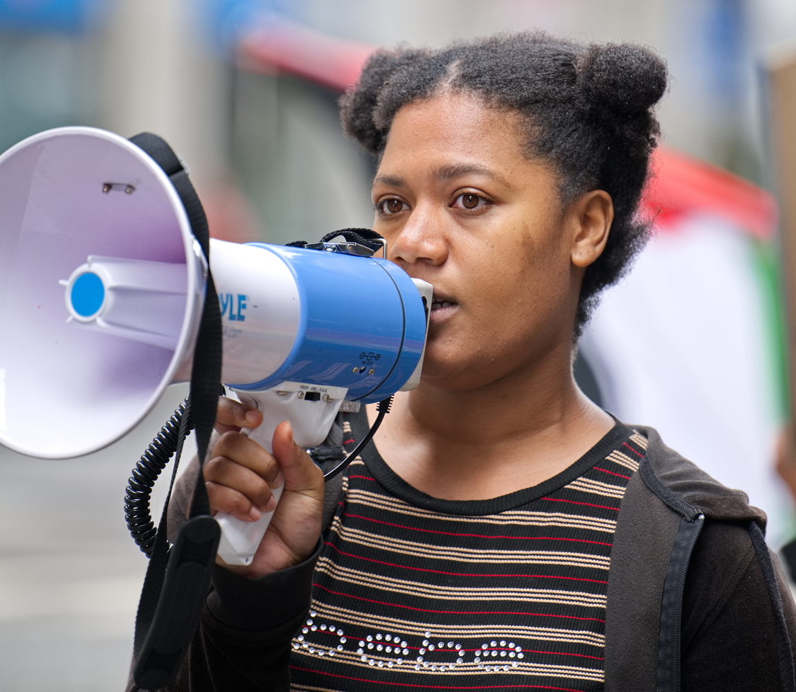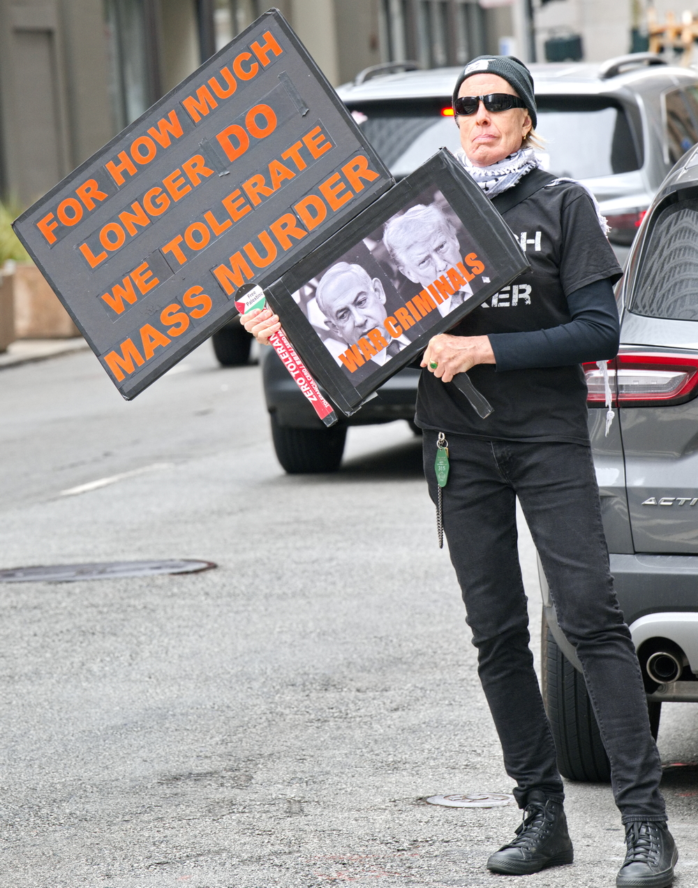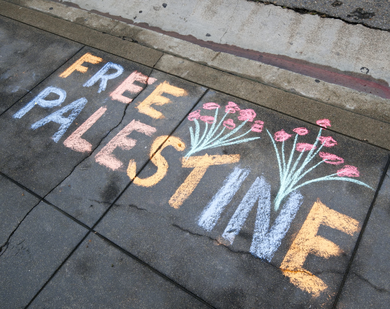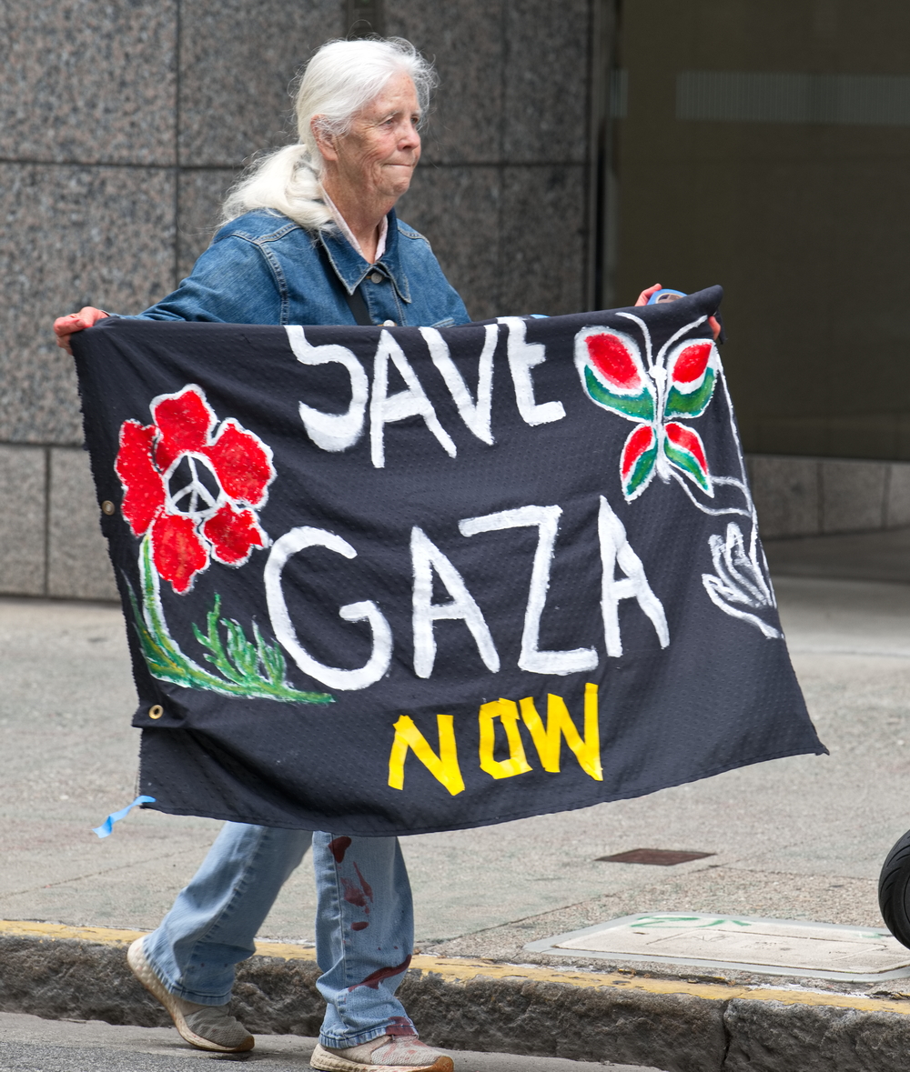 (San Francisco, Sept. 12) - When the Israeli Consul in San Francisco decided that red 'blood' in the street resulting from any demonstration should be hosed away, he was probably not counting on the symbolism of 'blood' flowing in the gutter in front of the Israeli consulate. The 'blood' flowed into the gutter as protesters drummed, banged on pots and pans, and blew horns. Others made bloody hand prints on an Israeli flag to protest the ongoing massacre by American bombs and starvation. Some held photos of skeletal starving children.As Netanyahu escalates his final solution for Palestine, the Trump-AIPAC campaign to use antisemitism, the hundreds year old scourge of Jews, to justify a Hilterian genocide, the absurd hypocrisy of the smearing continues.
