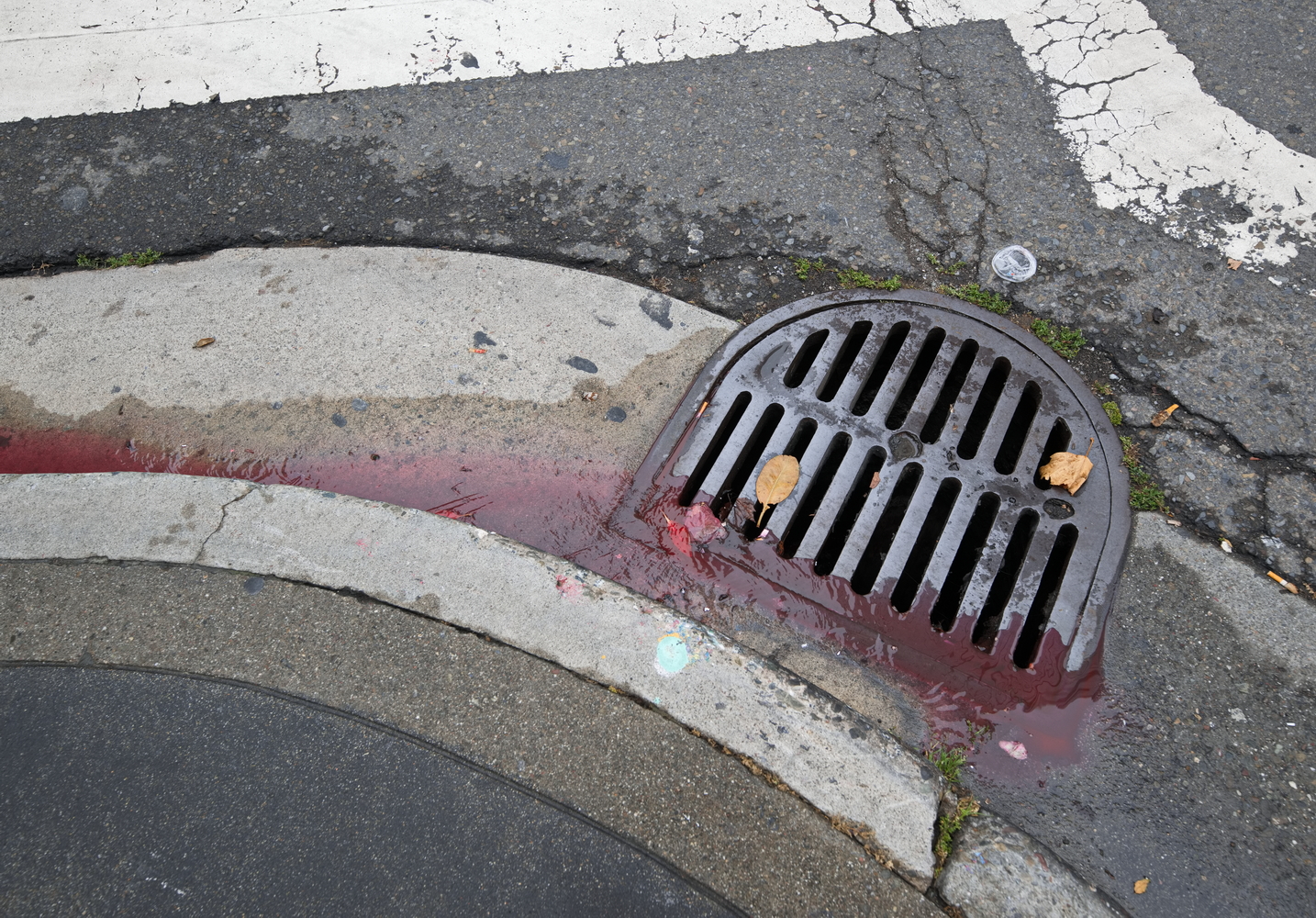 A look they did not intend as 'blood' is hosed off the sidewalk