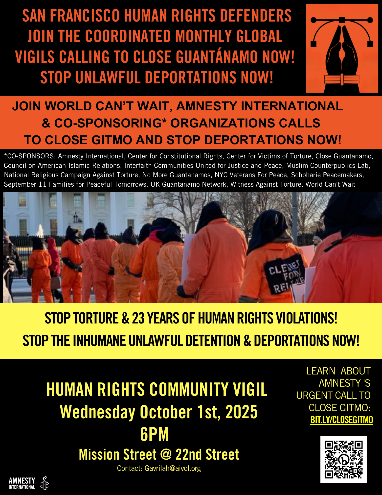 Come join us in community with human rights defenders around the world on another 1st Wednesday monthly Close Guantánamo Global Vigil!