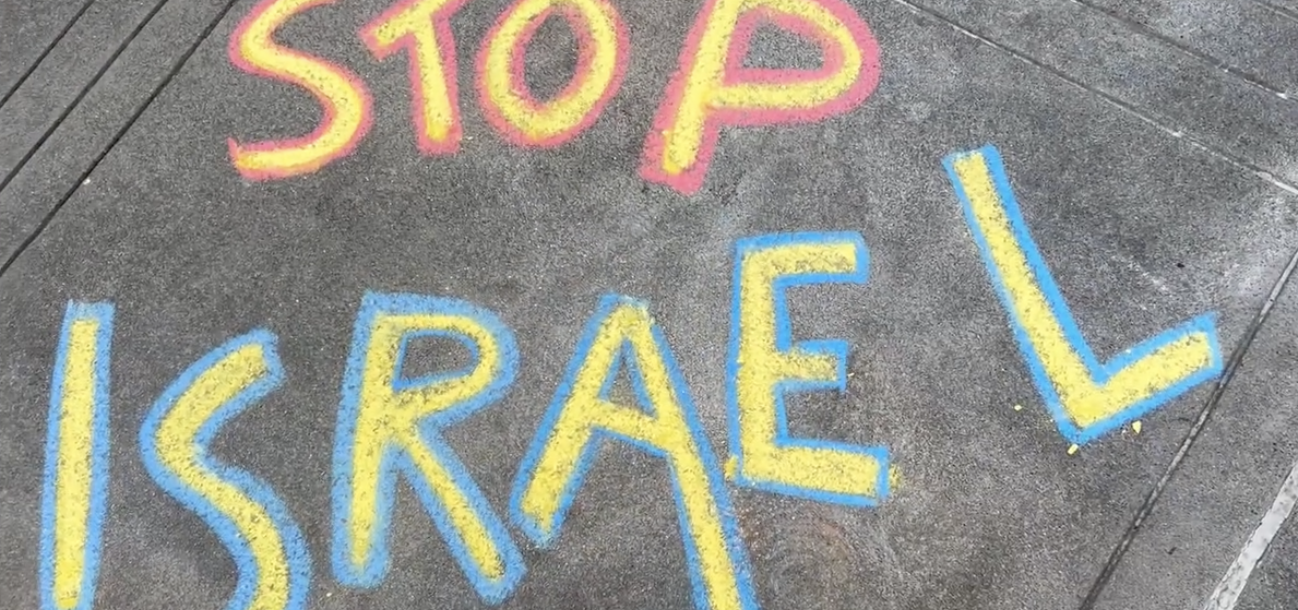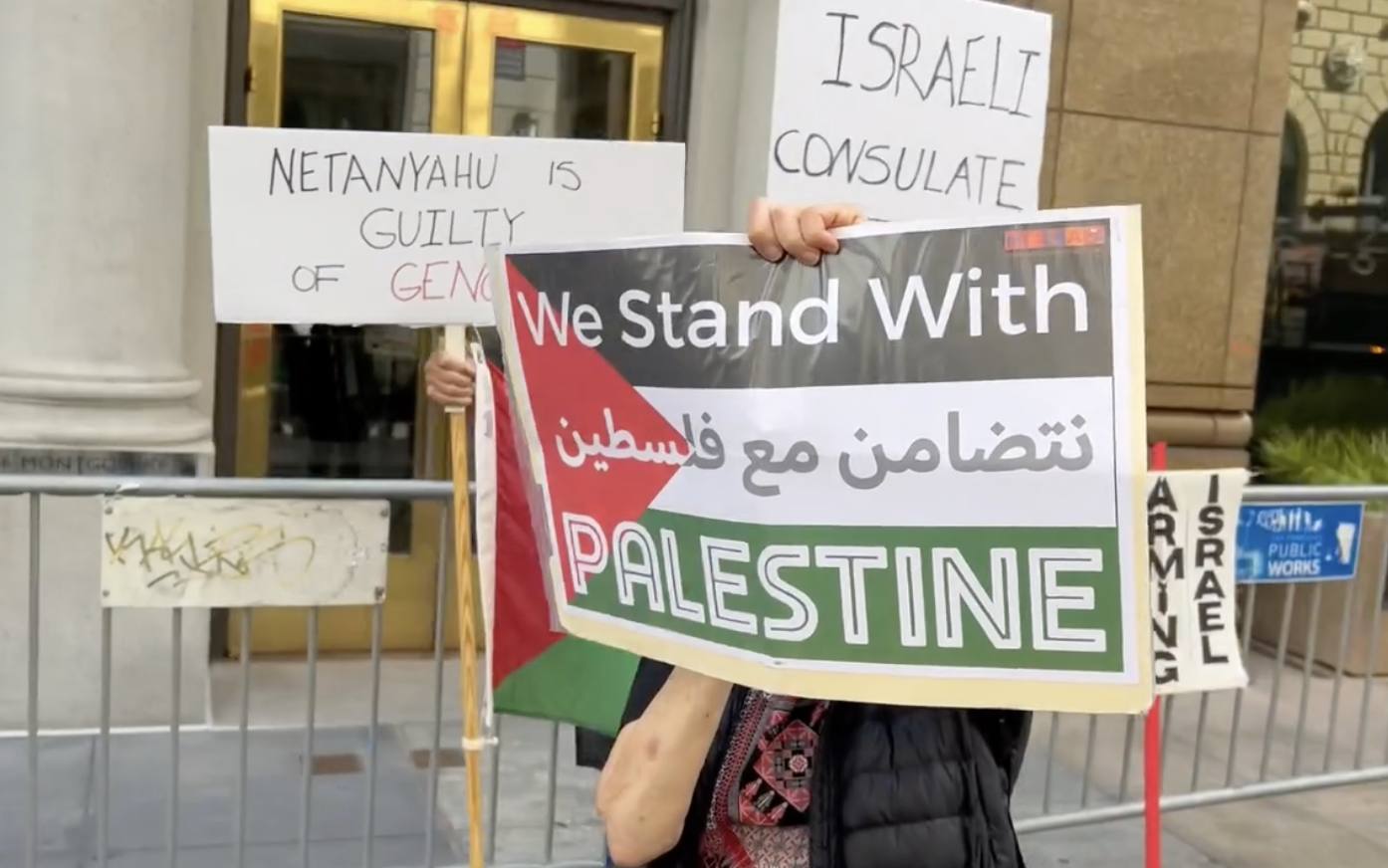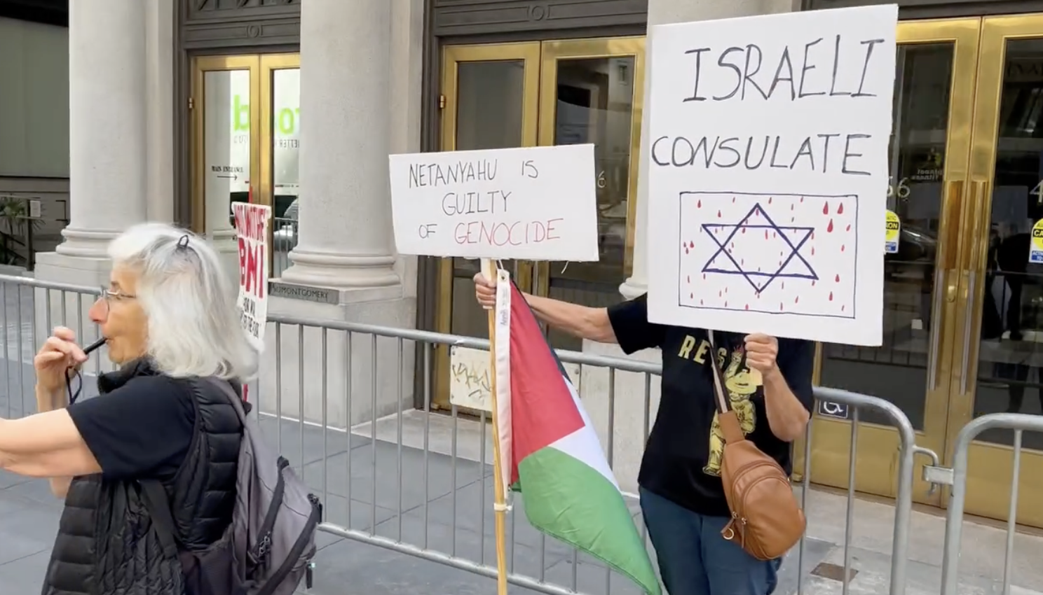 LOUD NOISE ACTION with HUGE BANNERS at the Israel Consulate to protest the criminal nation's horrible war crimes -