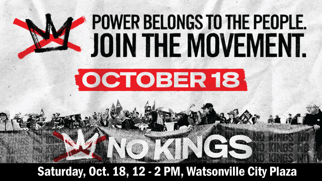 On October 18, Indivisible Pajaro Valley is hosting a NO KINGS rally at Watsonville City Plaza to raise our voices and wave our signs to protest this corrupt administration. Let's double the attendance we had in Watsonville on No Kings Day in June! 1,500 of us turned out then; let's make it 3,000 strong this time. Bring a friend and ask them to bring a friend.