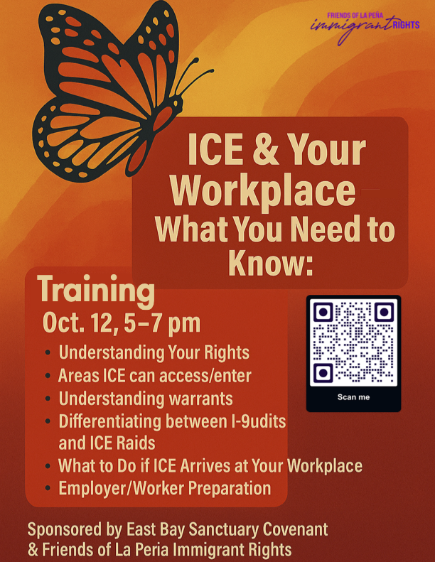 On Sunday, October 12 5-7pm, the East Bay Sanctuary Covenant and Friends of La Peña Immigrant Rights Committee are holding a training ICE & Your Workplace: What You Need to Know. This training will prepare employers, employees, and community members to understand their rights and responsibilities if immigration agents visit their offices, businesses or facilities. It will also cover how to develop policies to address immigration agent interactions at the workplace and tips for navigating immigration enforcement raids.