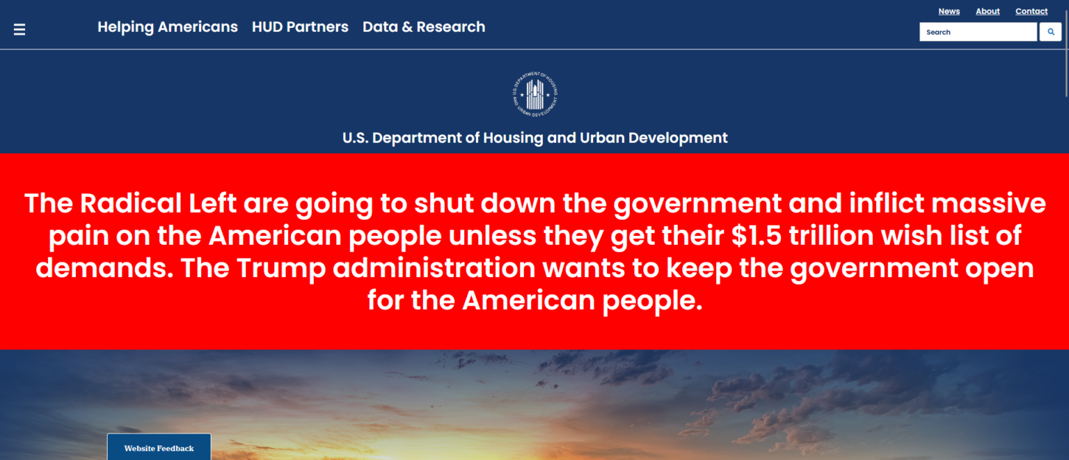 On the website of the Department of Housing and Urban Development website (HUD), in a potential Hatch Act violation HUD is falsely claiming that the “radical left” is to blame for the government shutdown.