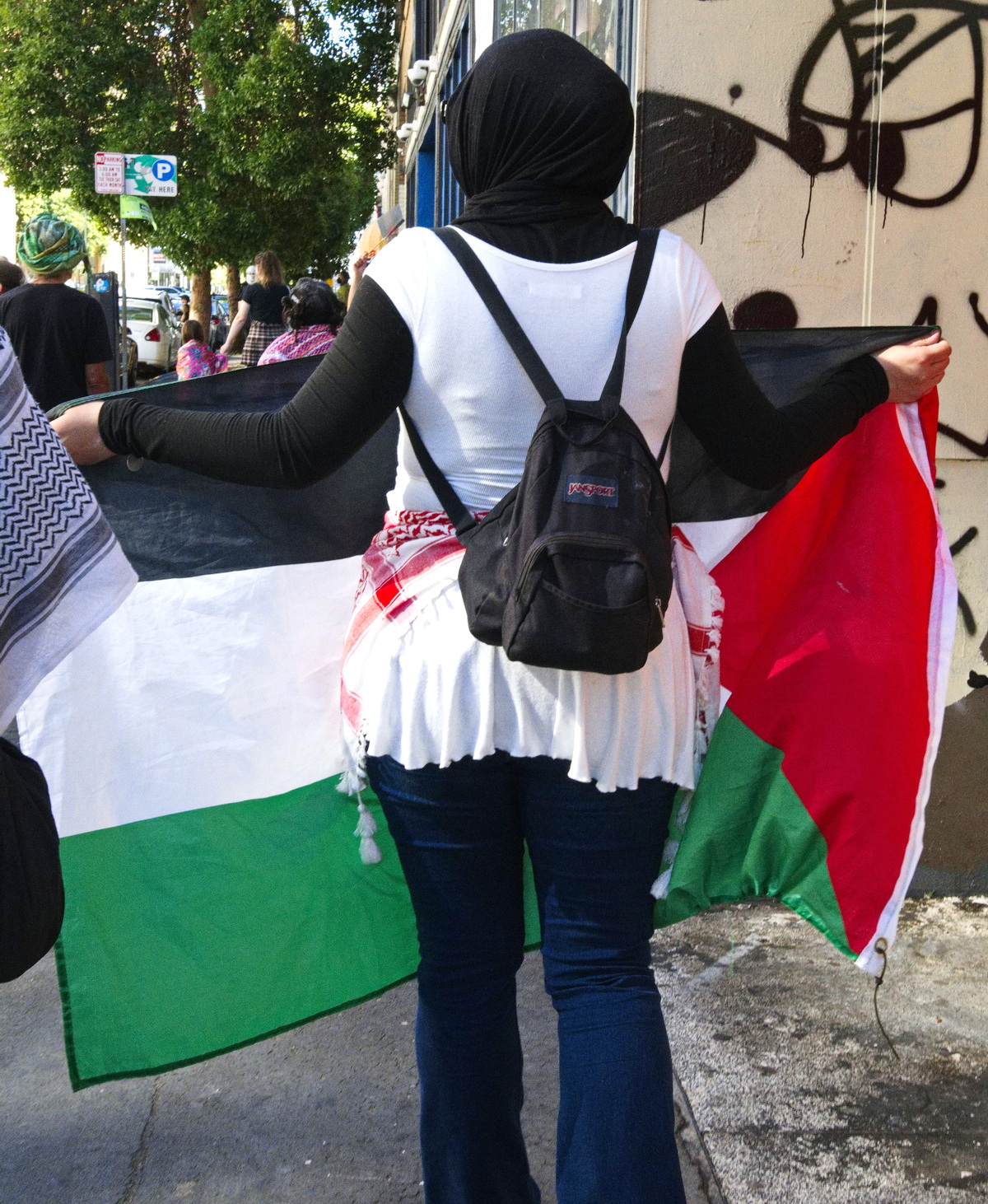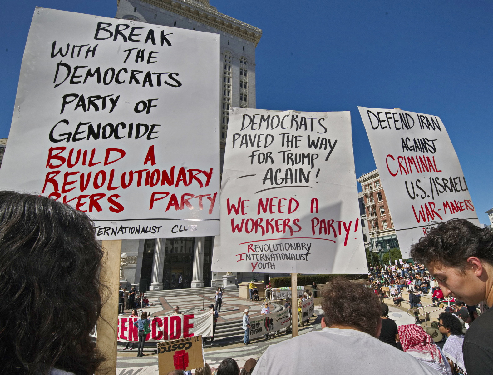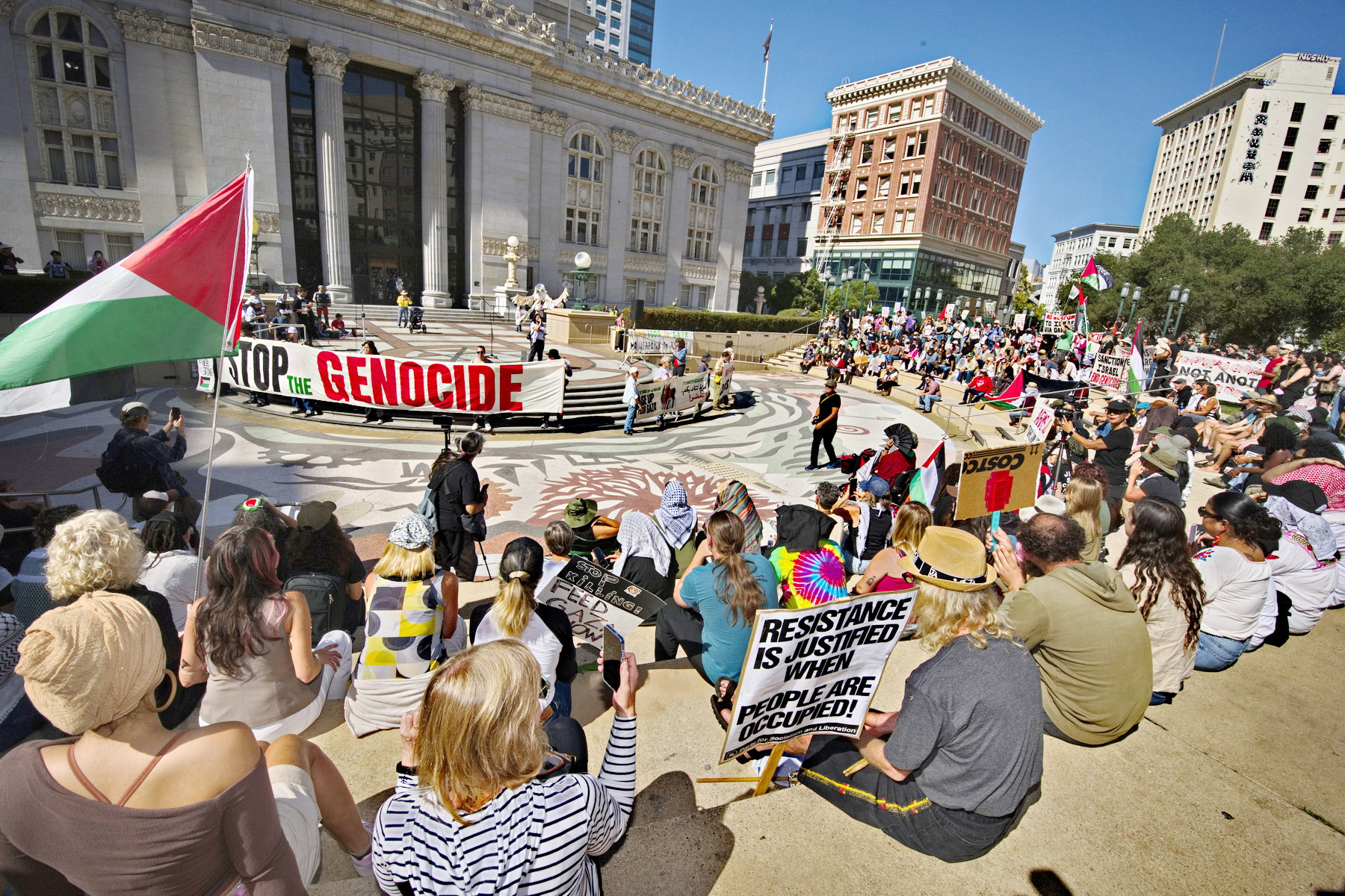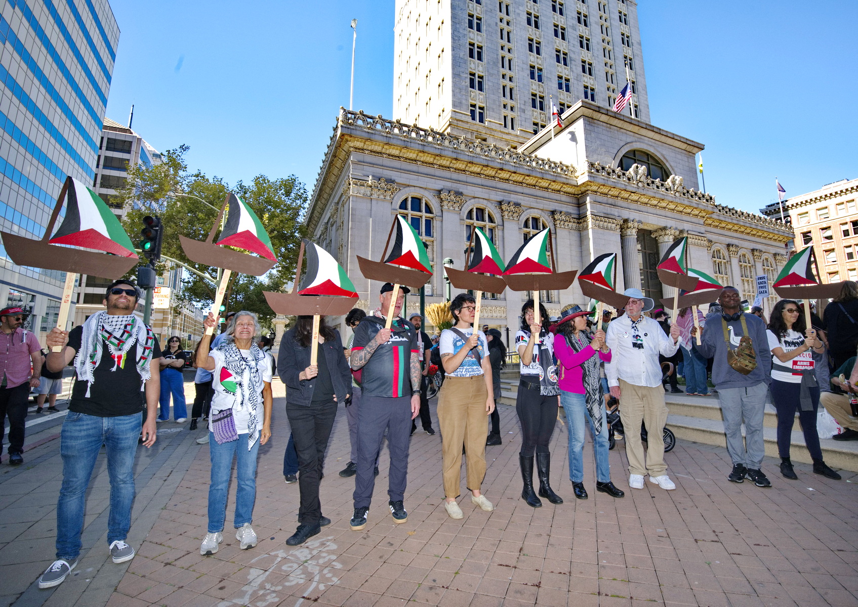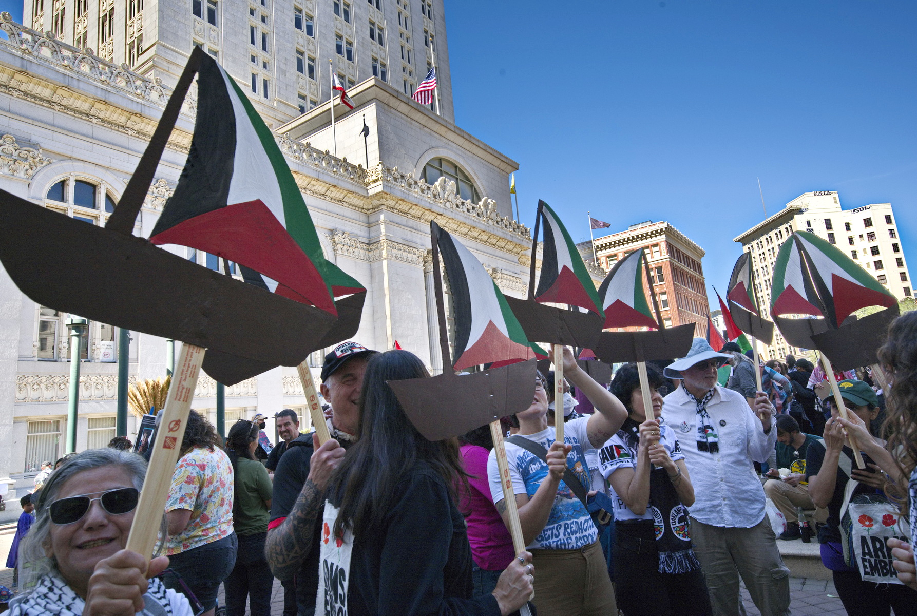 Oakland, Oct. 4) - The rally started at Frank Ogawa Plaza where at least a thousand heard speakers demand an end to the U.S. armed genocide of the Palestinian people.The protesters then assembled on Fourteenth Street behind a sound truck and banners. A group held aloft little Palestinian themed "sailboats" to symbolize the flotilla attempting to break Israel's blockade of Gaza. Israel is now intercepting and attacking the civilian boats in international waters, in a blatant act of piracy.