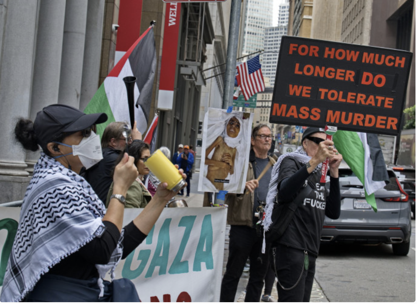 We have megaphones, drums, trumpets, whistles, and air horns to share, plus bring your own pots and pans to beat on the barricades they set up to separate us from the filthy genocidists inside.