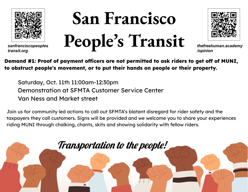 Join us for community led actions to call out SFMTA’s blatant disregard for rider safety and the taxpayers they call customers. Signs and chalk will be provided. We welcome you to share your experiences riding MUNI through chalking, chants, skits and showing solidarity with fellow riders.