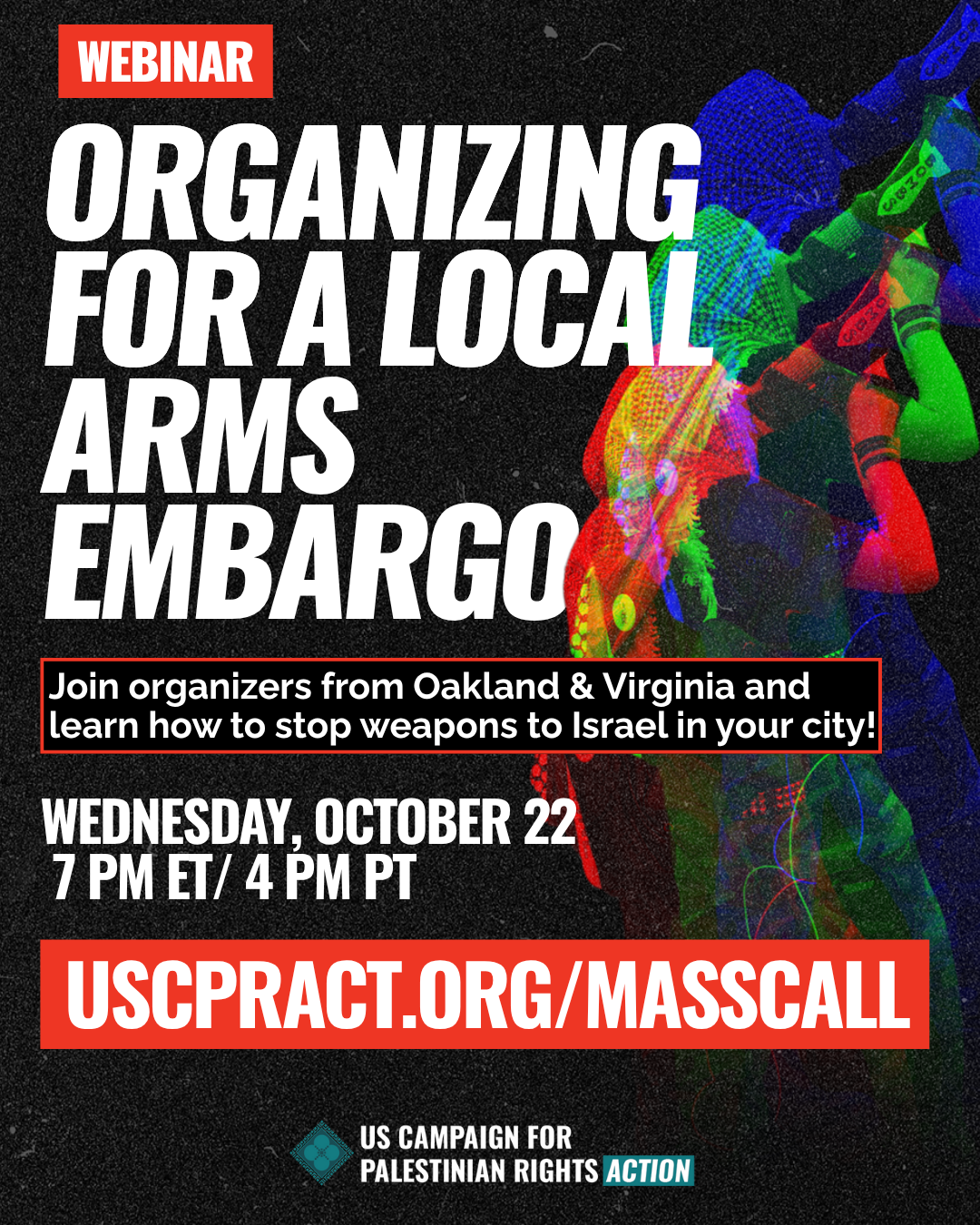 To hear about global efforts for a people’s arms embargo, and to learn more about how you can organize for an arms embargo in your locale, join our next Mass Movement Call.