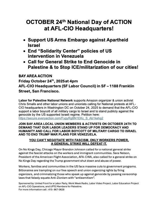 On October 24, 2025 we urge trade unions and supporters of Palestine and Venezuela to join the action at the AFL-CIO in DC and in San Francisco or wherever actions will take place.
