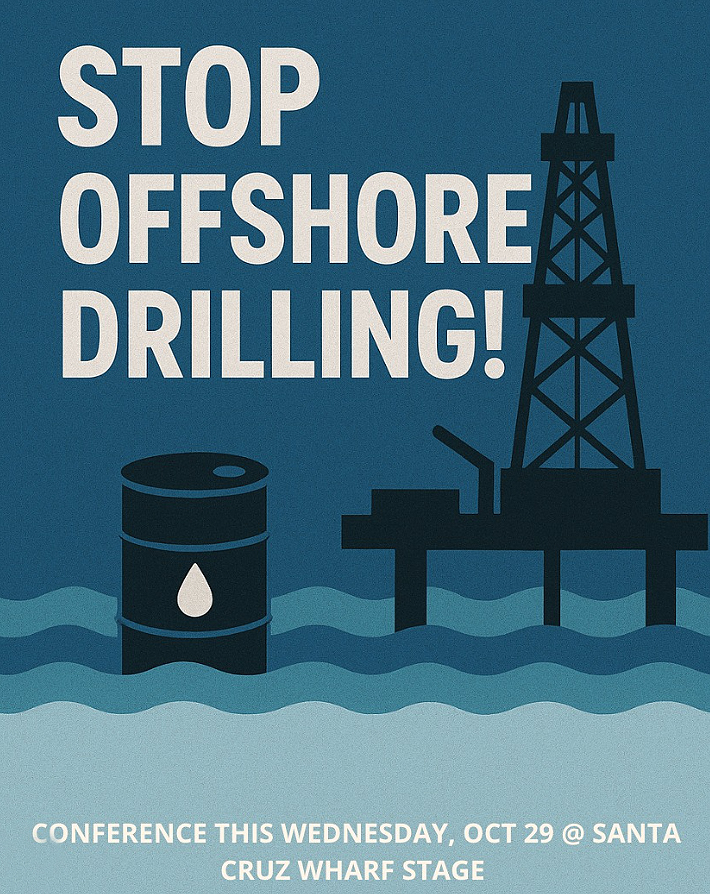 New plans to expand offshore oil drilling threaten California’s coastline — including right here in Monterey Bay. The City of Santa Cruz is hosting a press conference next Wednesday, Oct 29 at 10 a.m. at the Santa Cruz Wharf stage to stand against these reckless proposals.