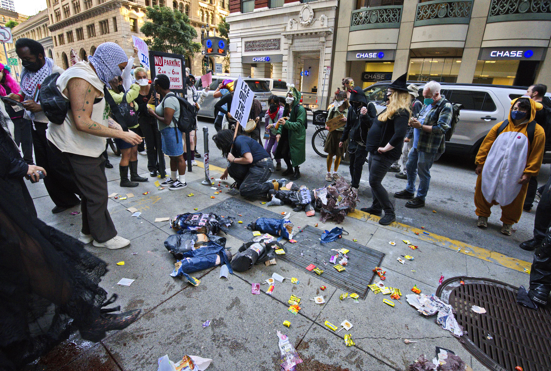 The Haloween event assembled at the Powell Street cable car turnaount. They unfurled their banners and marched down Market to Montgomery Street, ending in front of the ICE courthouse at 100 Montgomery Street, renamed the “ICE Abduction Center.”A common technique of oppression is to appropriate not only reality by replacing truth with fantasy but by appropriating the visual and behavioral language itself.