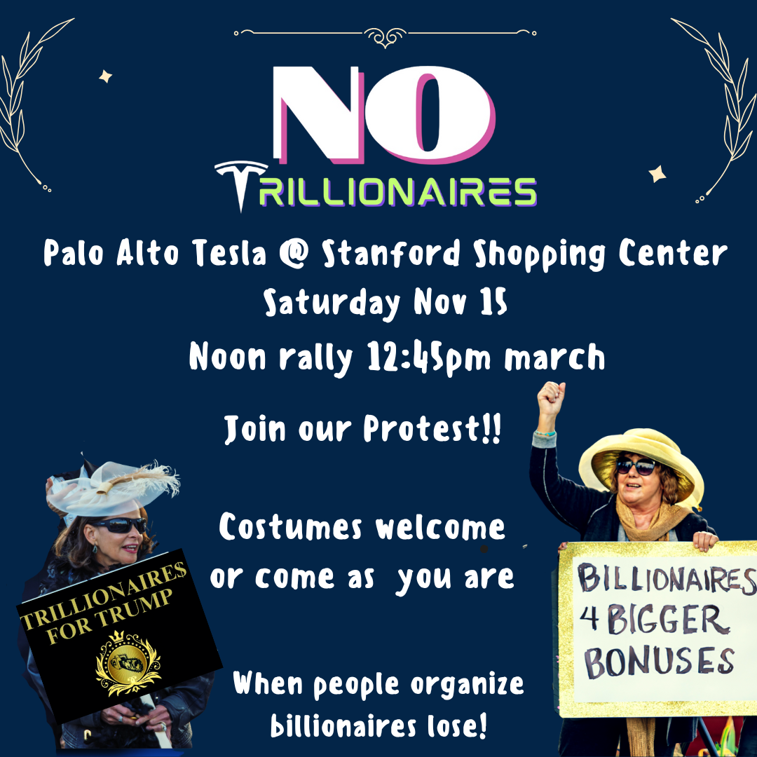 On national day of action “No Trillionaires” join us at Stanford Shopping Center Tesla showroom. Noon rally in front of the showroom and at around 12:45 pm we march to Tiffany’s (Tiffany&Co.) where the satirical Billionaires for Bigger Bonuses and Trillionaires for Trump will mock the ultra wealthy with singalong for the audience of shoppers.