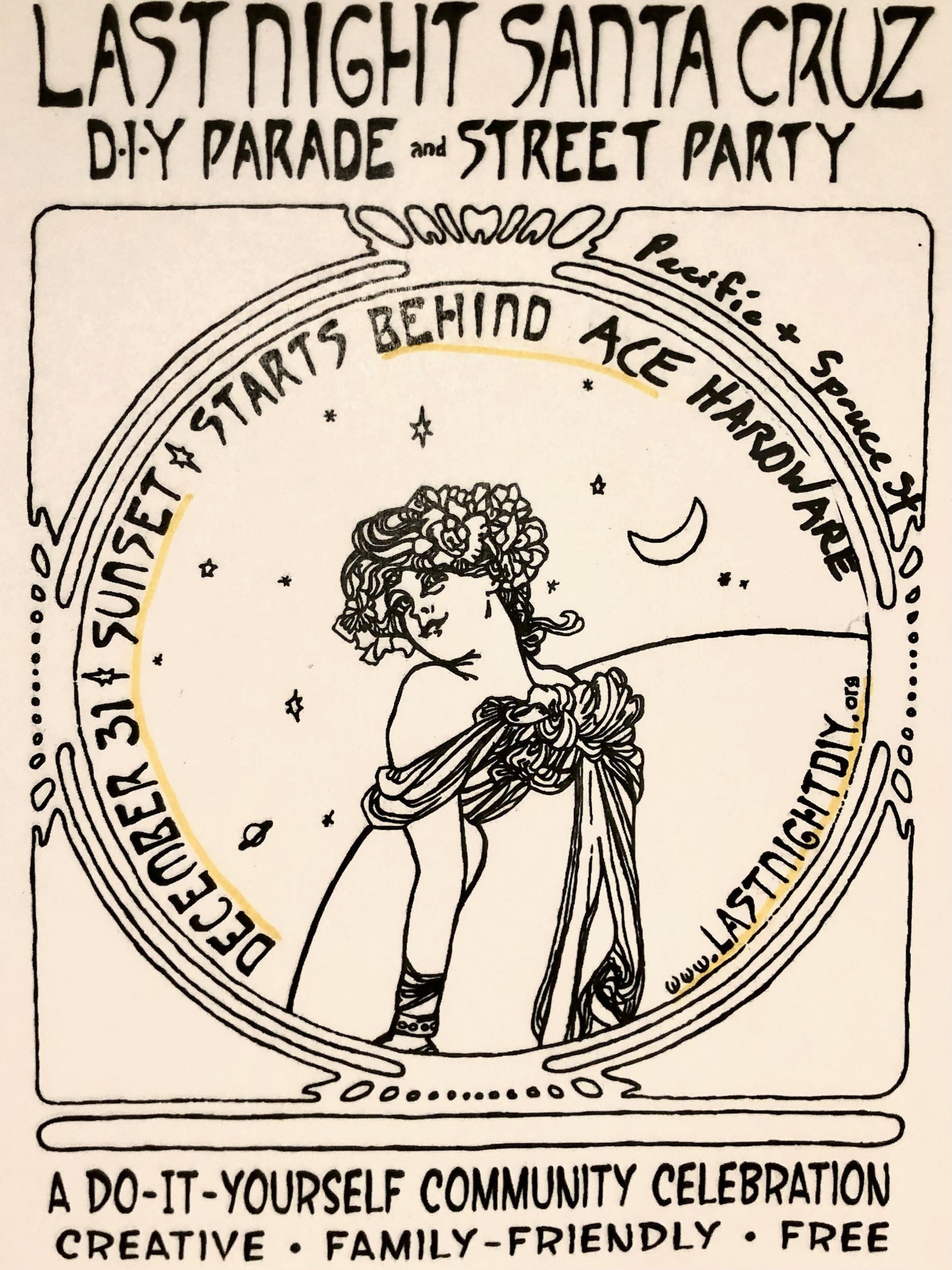 Last Night DIY New Years Parade is happening this year!! Save the date! Currently, the plan is to meet at the corner of Pacific and Spruce at 5:30 pm on New Year's Eve 2025! We also plan on having some community workshops during the month of December to build puppets, floats, and other parade offerings. Stay tuned for more details.