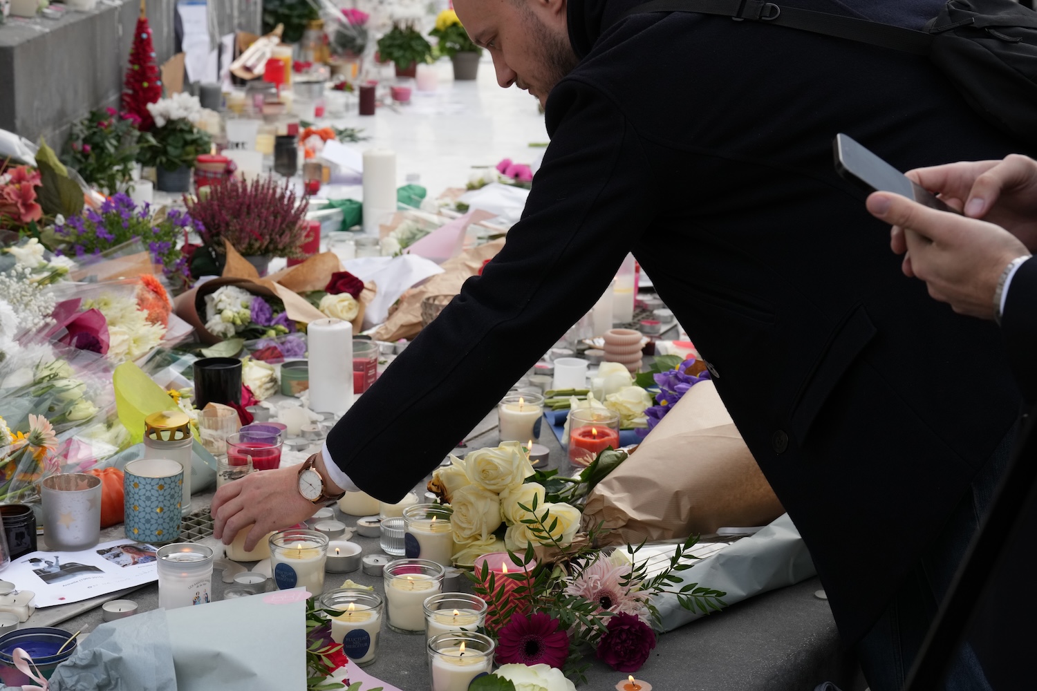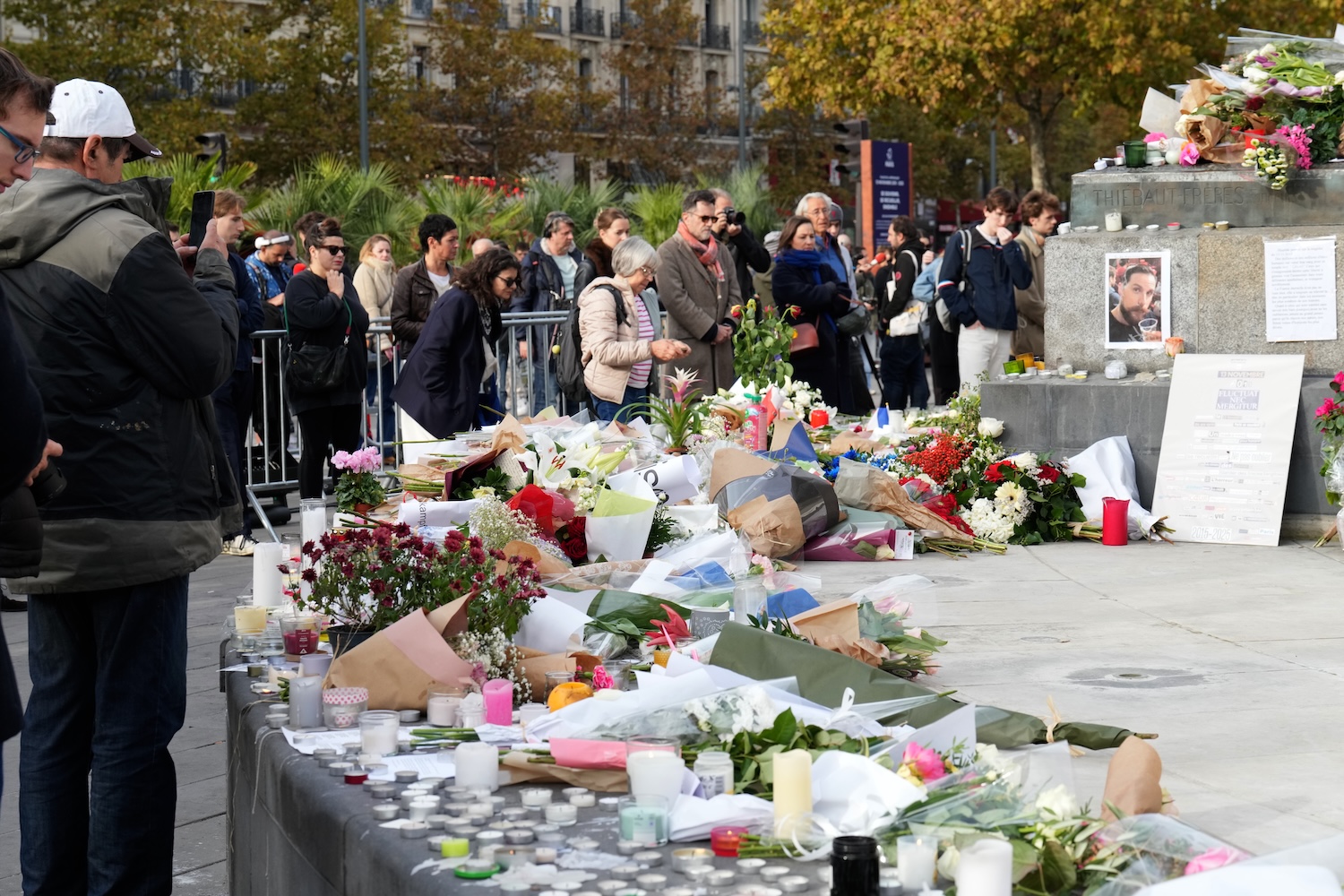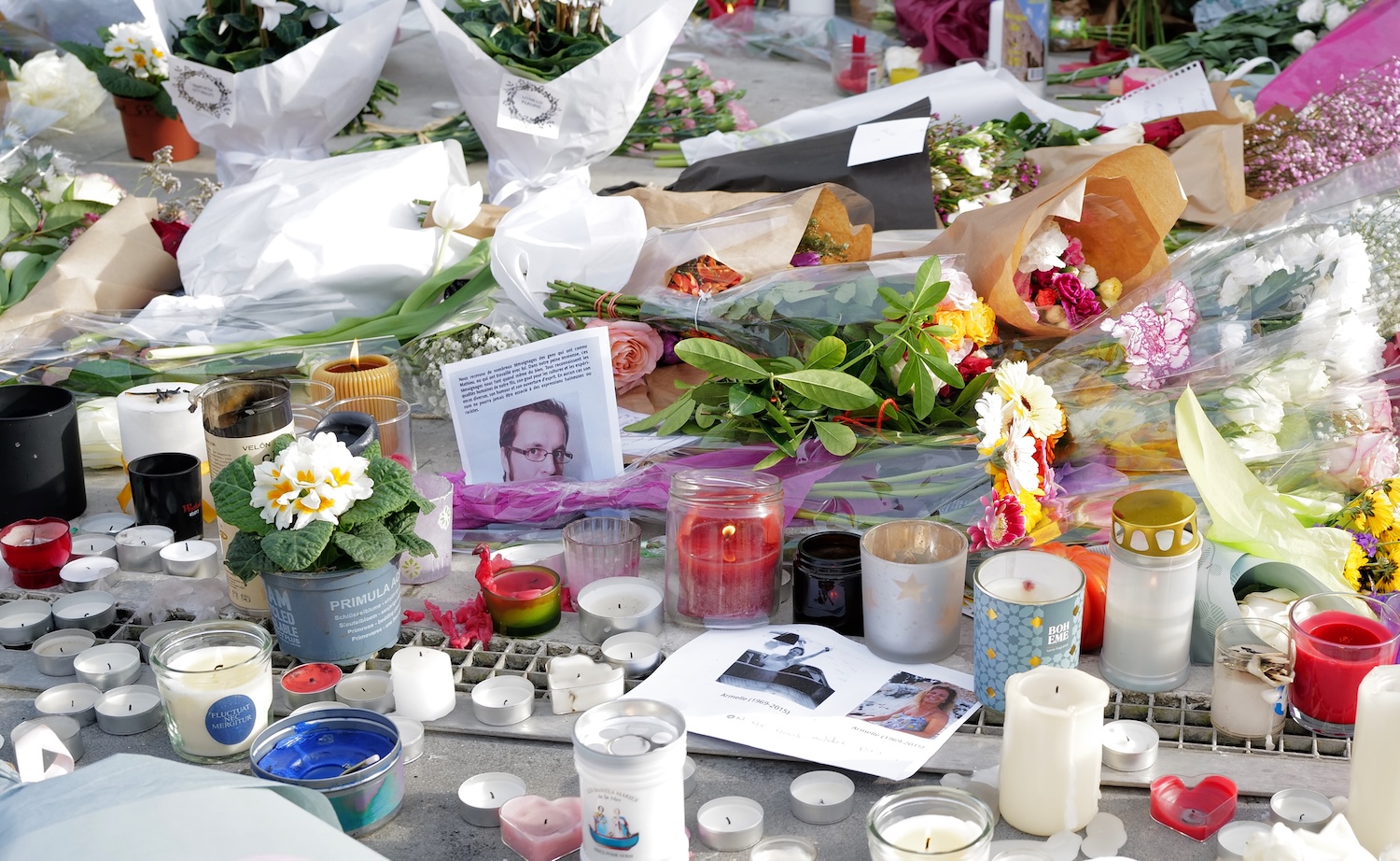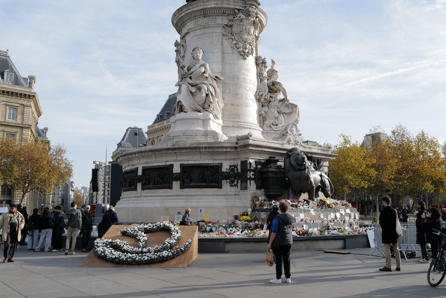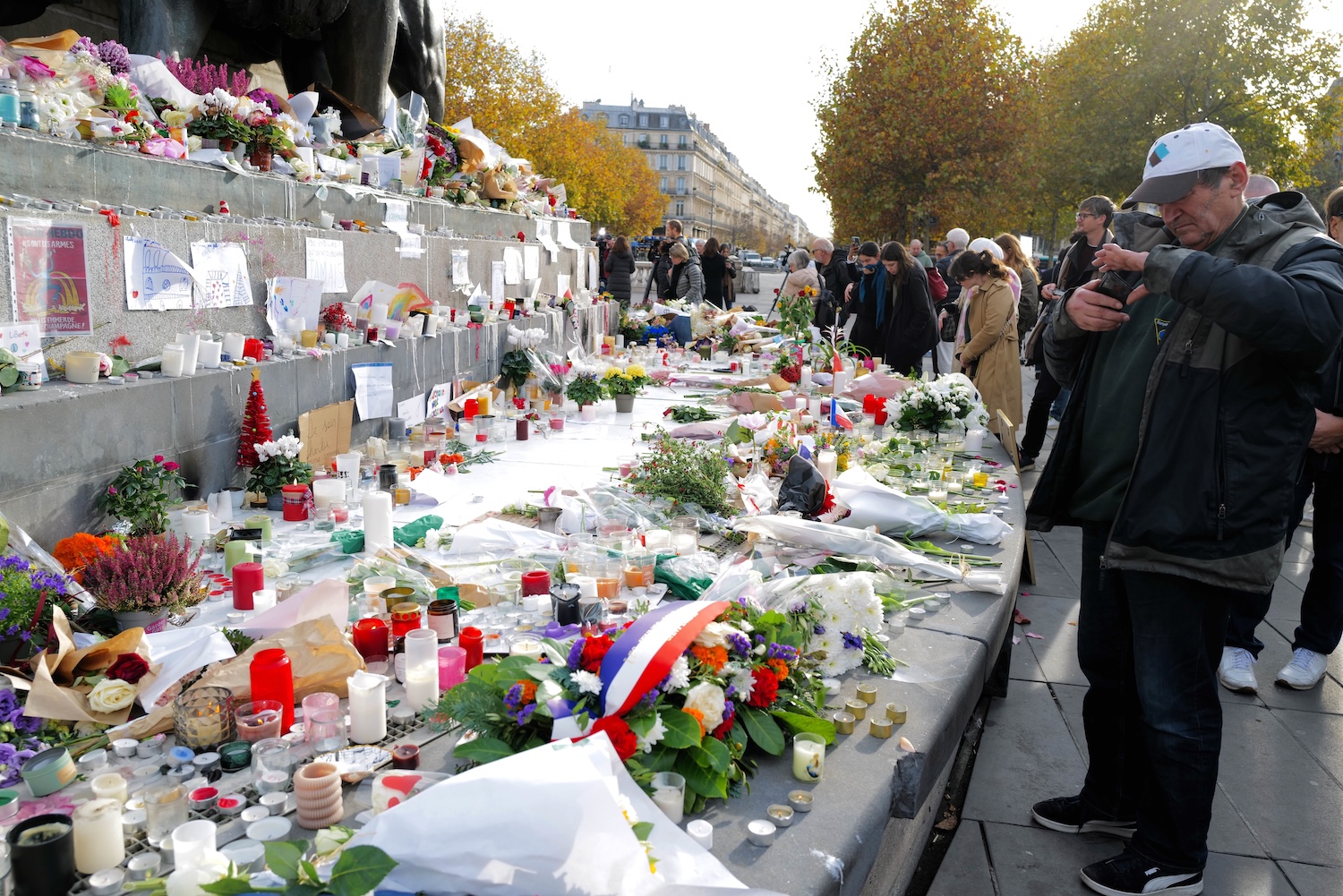 At the Place de la Républic an impromptu memorial was created the evening before by citizens who laid flowers and placed candles along with notes and messages, some accompanied by photos of victims, at the base of the towering monument. The wax drippings from candles which accumulated on the cold granite base of the monument were evocative of tears for the victims.