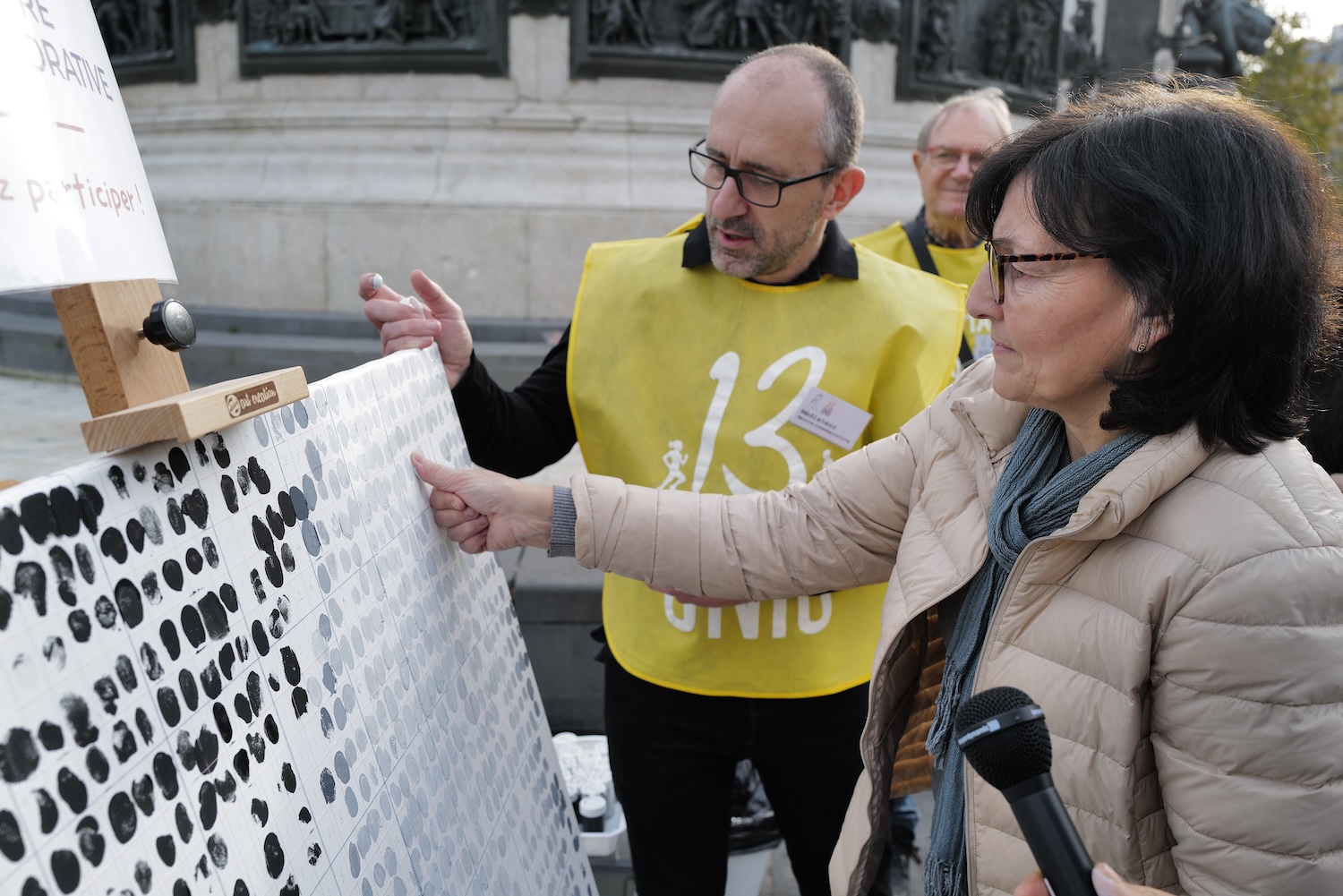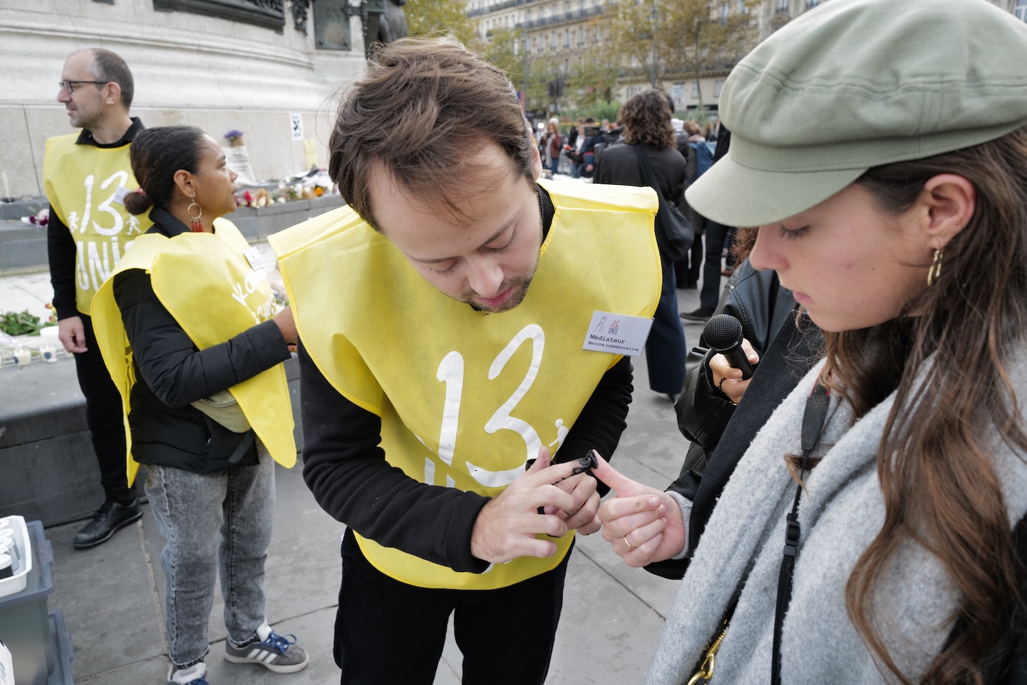 Participants were invited to leave an impression of their fingerprint in either black or white ink placed precisely on a large sheet of white canvas divided into grids. In all, six panels, one being created at each of the day’s memorials, when completed will be joined together to make an image of a hand grabbing an arm with a raised clenched fist as a powerful symbol of solidarity and resistance to terrorism.
