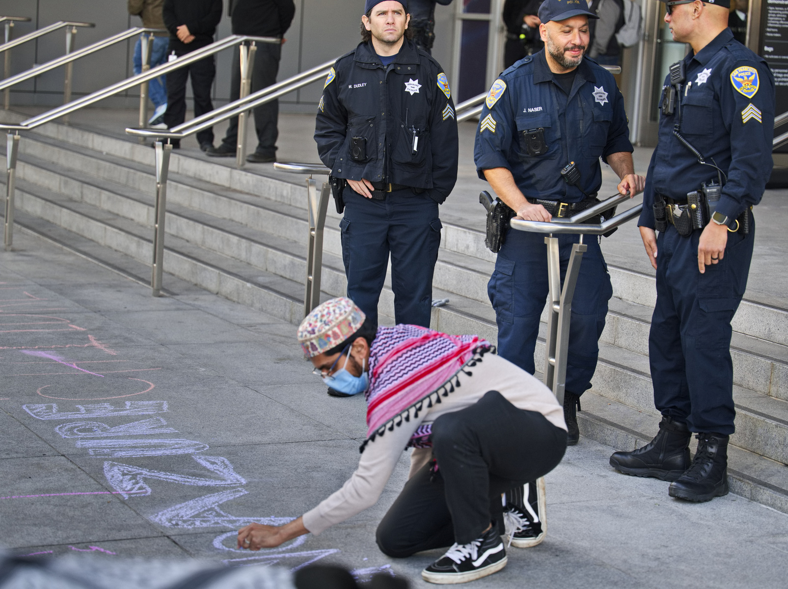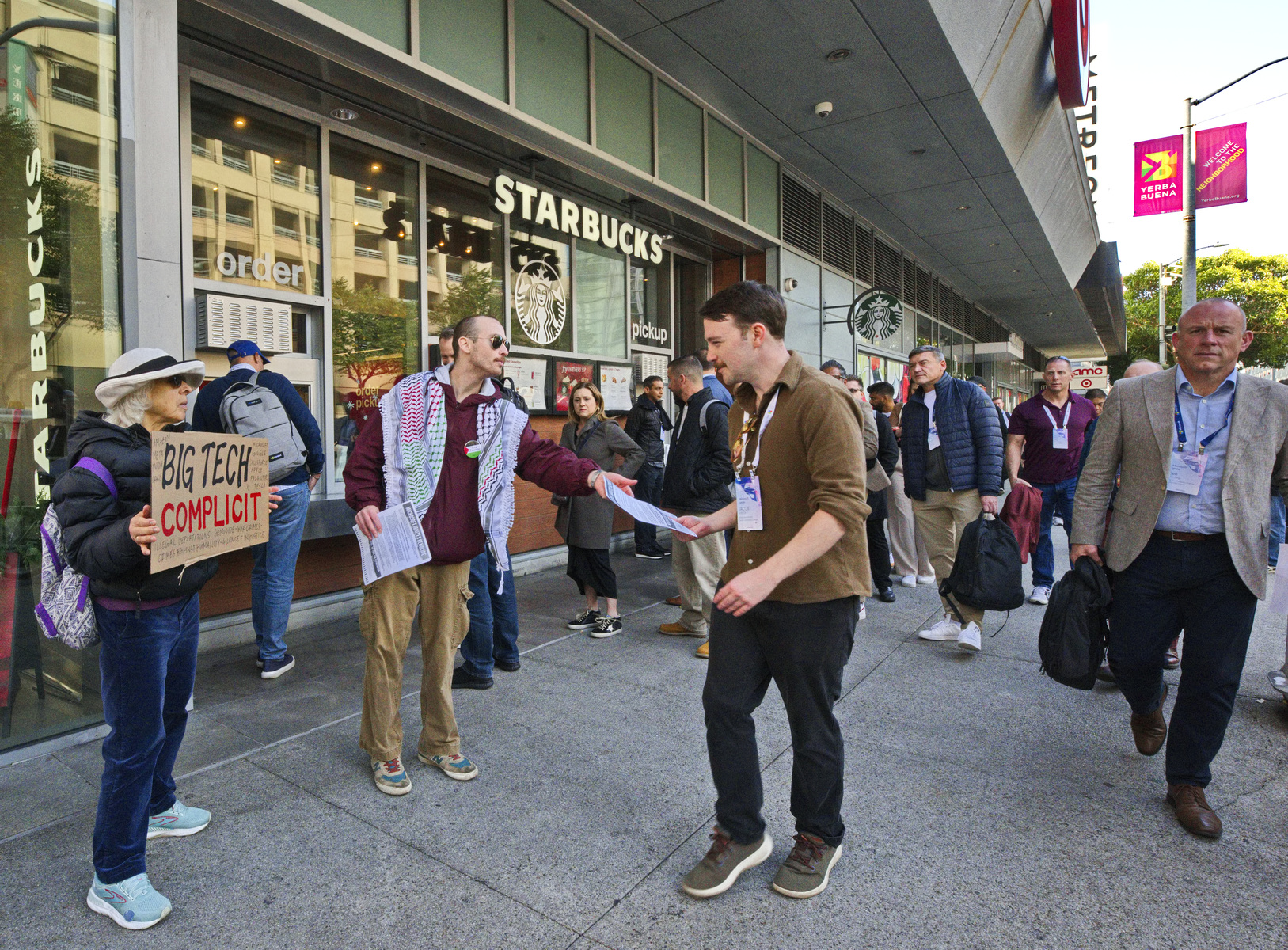 At Moscone West, protesters confronted conference-goers while security attempted to lock down the venue, barricade entrances, and blast music to drown out the chanting, which was heard throughout the venue.