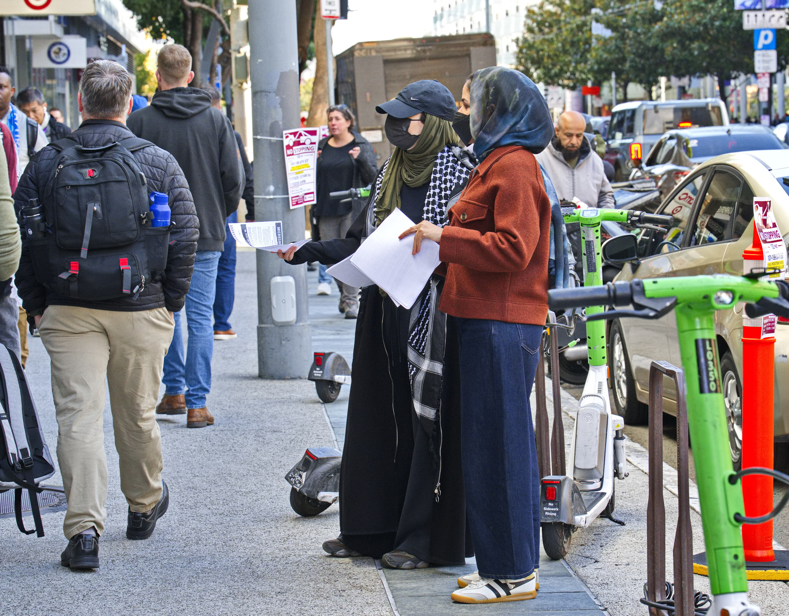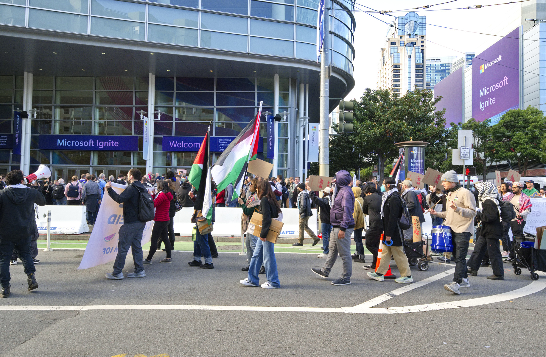 (San Francisco, Nov. 18) - No Azure for Apartheid (NOAA) protested outside the conference at the Moscone Center as thousands of attendees made their way in and out of the venue. Protesters marched from Yerba Buena Gardens to Moscone West, while flyering, drumming, and chanting "say it loud and say it clear, Microsoft is a war profiteer," "Microsoft you can't hide, You sell tech for genocide," and "free free Palestine."