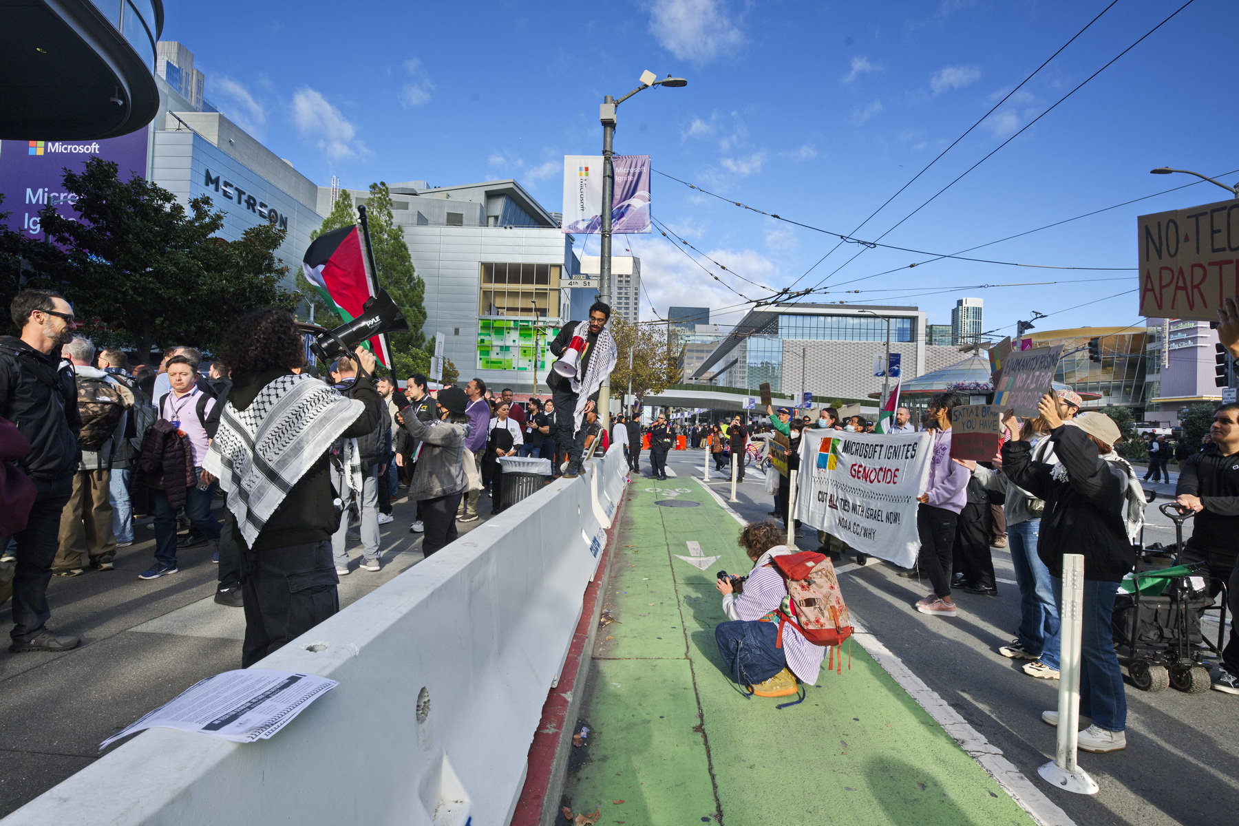 Protesters then marched to the pedestrian bridge connecting East and West campus, where they distributed flyers and zines to passing workers, delivered speeches implicating Microsoft in crimes against humanity in Palestine, and raised a banner drawing with a message that read "Ignite the Worker Intifada."