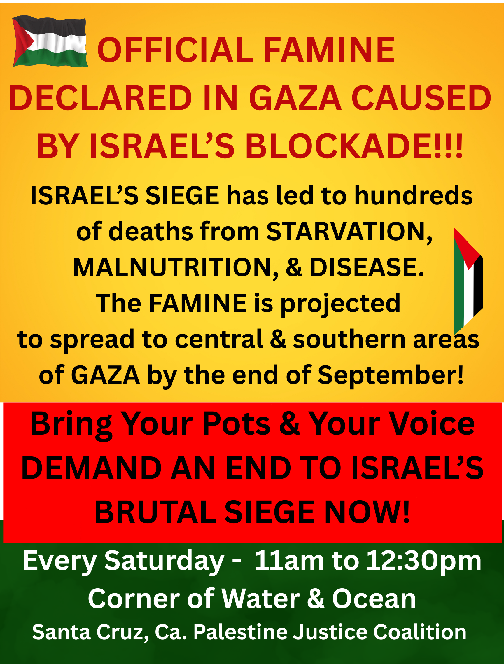 The Palestine Justice Coalition invites local peace activists to join our weekly vigil at Ocean and Water on Saturdays, 11:00 AM - 12:30 PM. Welcome tourists with good spirits and support for Palestinian Rights, BDS and Ceasefire and opposition to Occupation, Apartheid and Genocide. We gather on the wide sidewalk in front of Starbucks (being conscientious about pedestrian access to pass on the sidewalk and corner curb cutouts) and park in the adjacent County Building parking lot.