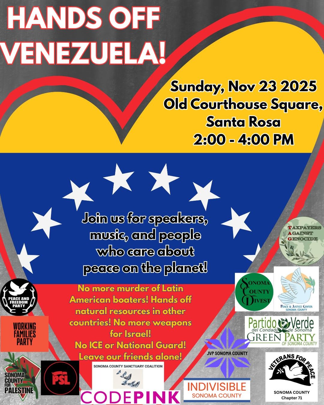 Sponsored by: Veterans For Peace #71, The Peace & Justice Center of Sonoma County, Sonoma County for Palestine, Green Party of Sonoma County., Taxpayers Against Genocide ,Jewish Voice for Peace Sonoma County, Sonoma County North Bay Working Families Party, CODEPINK, Sonoma County Divest, Party for Socialism and Liberation, Indivisible Sonoma County, Sonoma County Sanctuary Coalition, Peace & Freedom Party Sonoma County