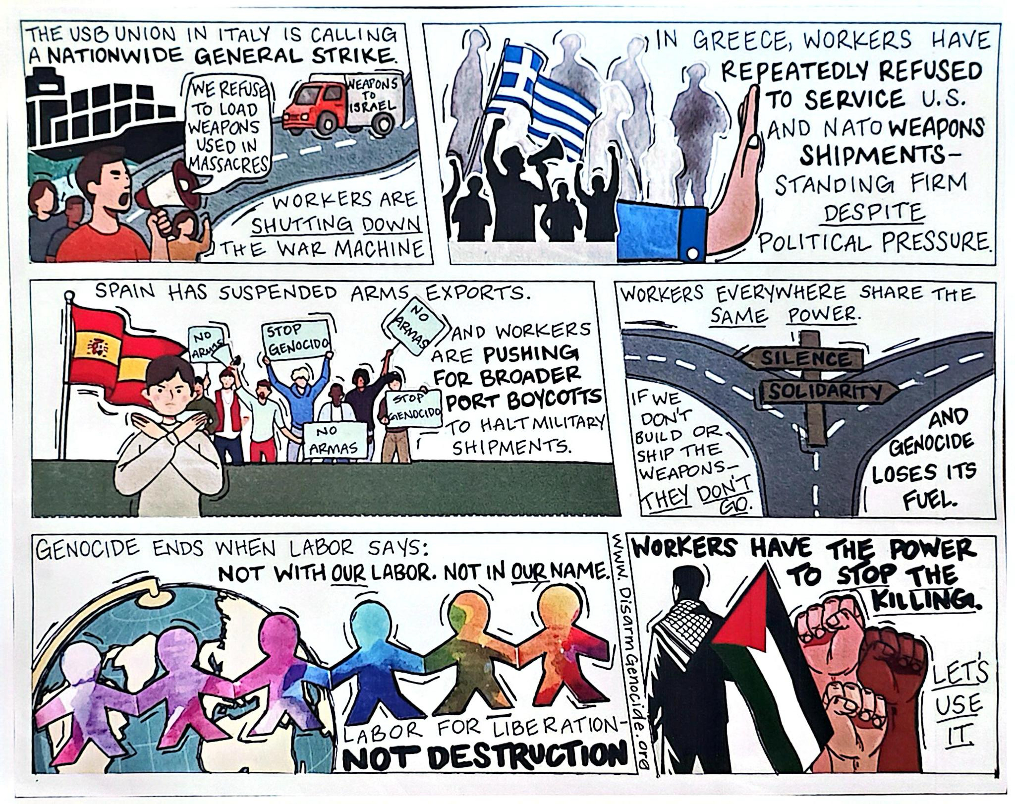 This cartoon is aimed at work union action to stop the genocide