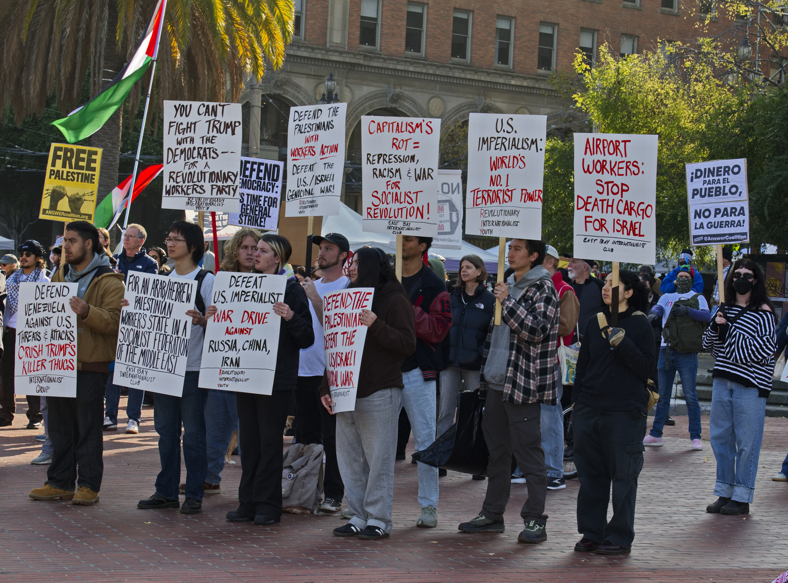 Sponsoring organizations included PSL (Party for Socialism and Liberation Bay Area), the Answer Coalition, Arms Embargo Now.org, Revolutionary Internationalist Youth, and BAMN (Coalition to Defend Affirmative Action, Integration & Immigrant Rights, and Fight for Equality By Any Means Necessary).