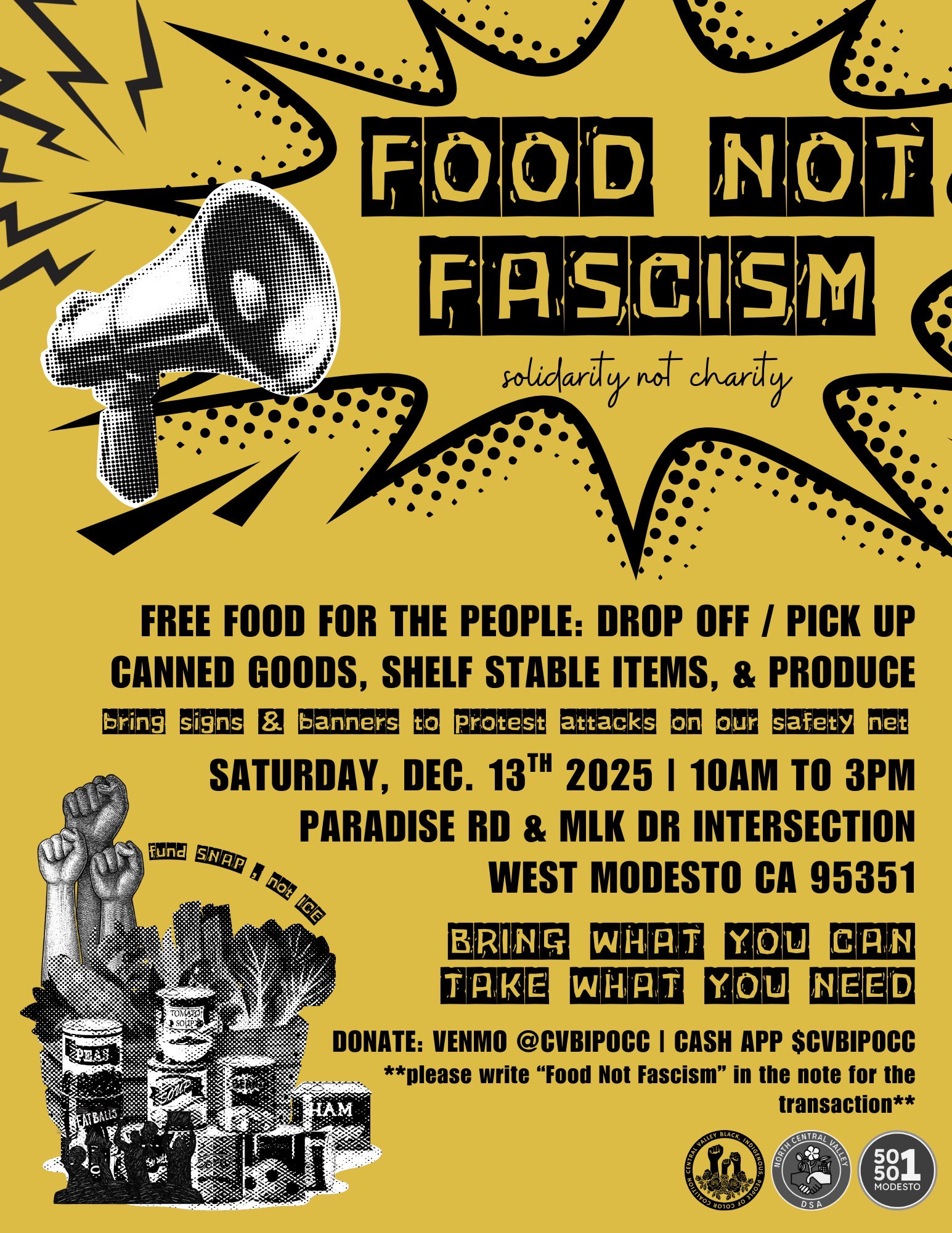 We are calling on progressive & leftist groups across the Modesto area to join us on 12/13 at 10a at the MLK intersection & Paradise (west side - landmark is Walgreens) to provide direct mutual aid to our community. Together, we will distribute free food to those impacted by the ongoing crisis while also peacefully gathering to hold signs and banners, denouncing the recent cuts and layoffs, and demanding an end to escalating state repression. Together, let us send a united message that we want FOOD NOT FASCISM.