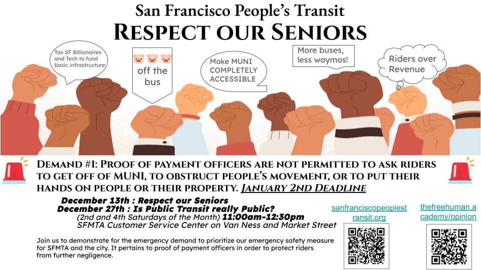 On December 2nd I read our demand at the SFMTA Board meeting: Proof of payment officers are not permitted to ask riders to get off of MUNI, to obstruct people’s movement, or to put their hands on people or their property. This demand is to protect riders from further negligence by SFMTA. Specifically we want to focus on the riders who are seniors and/or disabled. They especially should not be aggressively ticketed, blocked or asked to get off of public transportation.