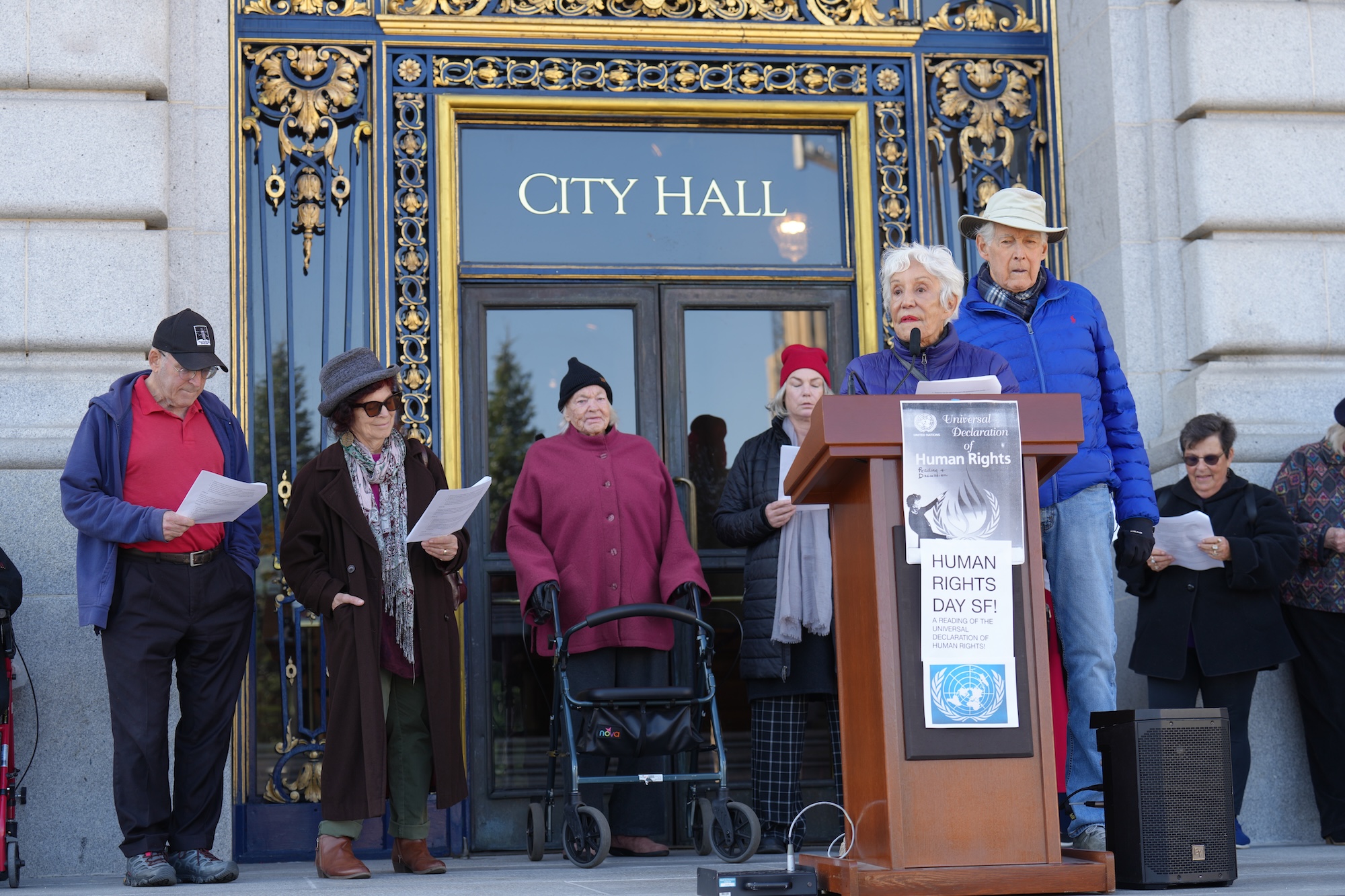 The Human Rights Day observed in San Francisco had an historic overtone as the United Nations was founded here in 1945 in the aftermath of WWII. Human rights activists commemorating Human Right Day gathered on the steps outside City Hall where several speakers addressed the present state of human rights both here and abroad. This was followed by a series of participants who each read one of the 30 articles contained in the UDHR.
