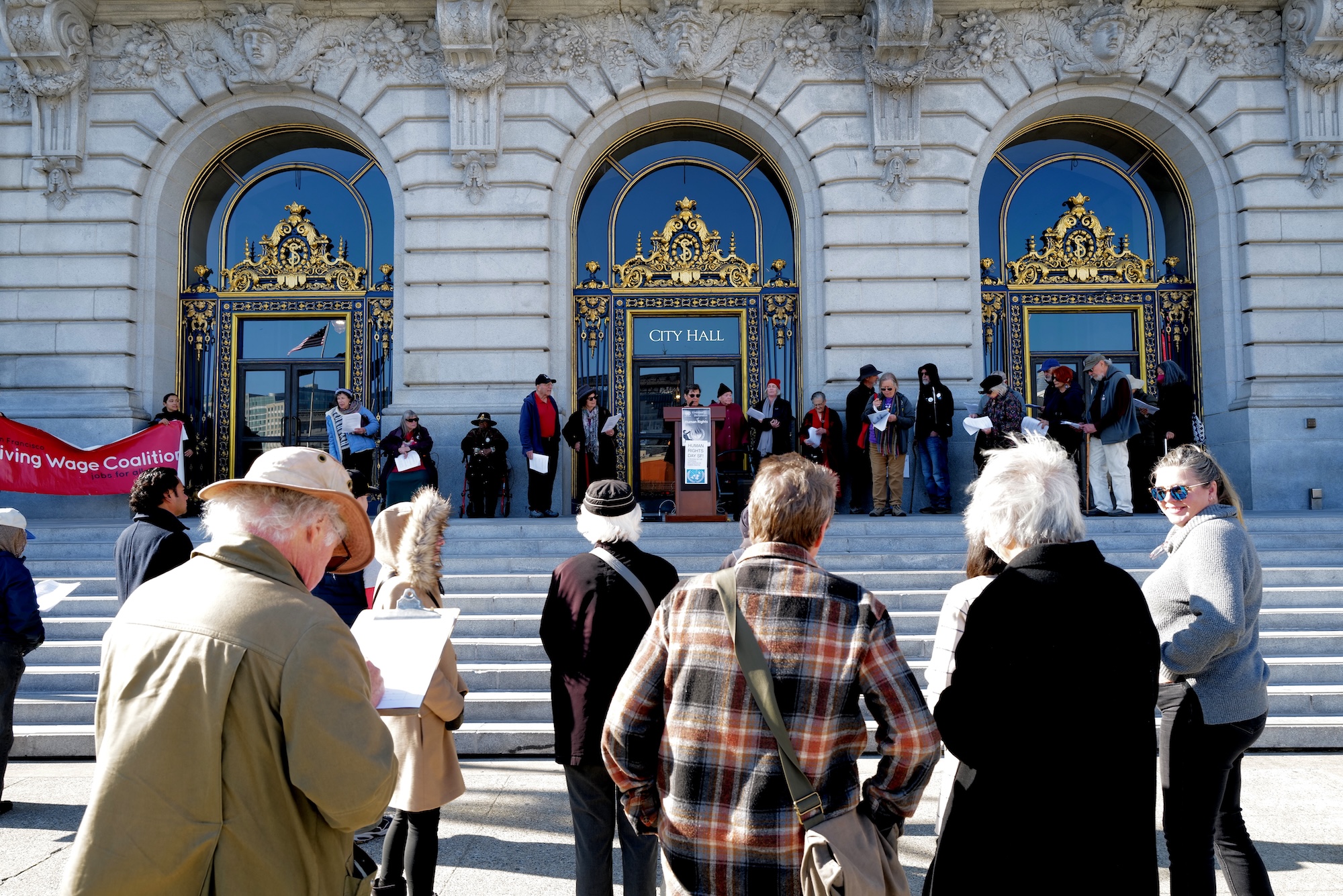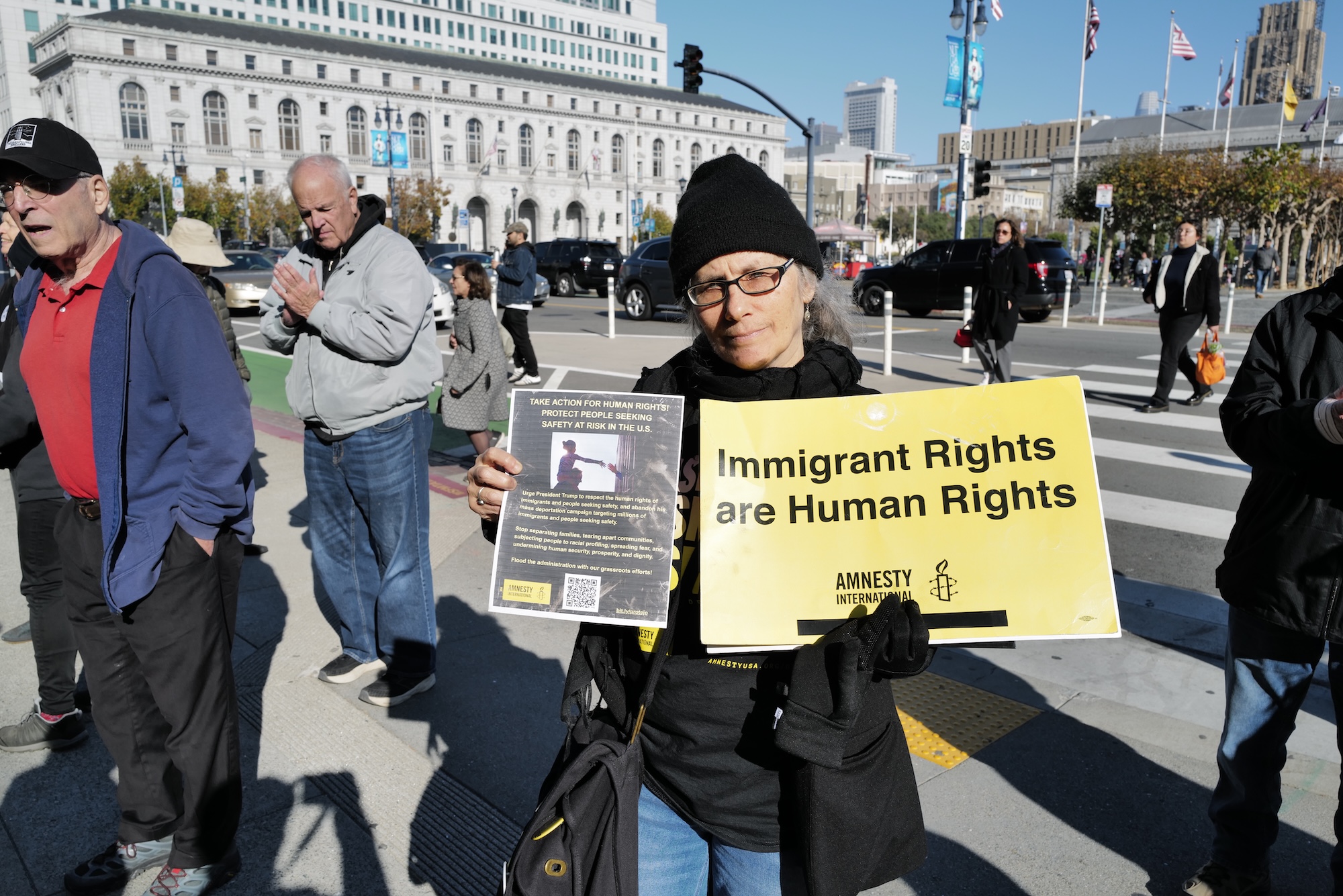 Human Rights activists observing Human Rights Day rallied at San Francisco City Hall to show support for the Universal Declaration of Human Rights signed in Paris in 1948, stressing the need now more than ever for its application in an era seeing a rise in Fascism.