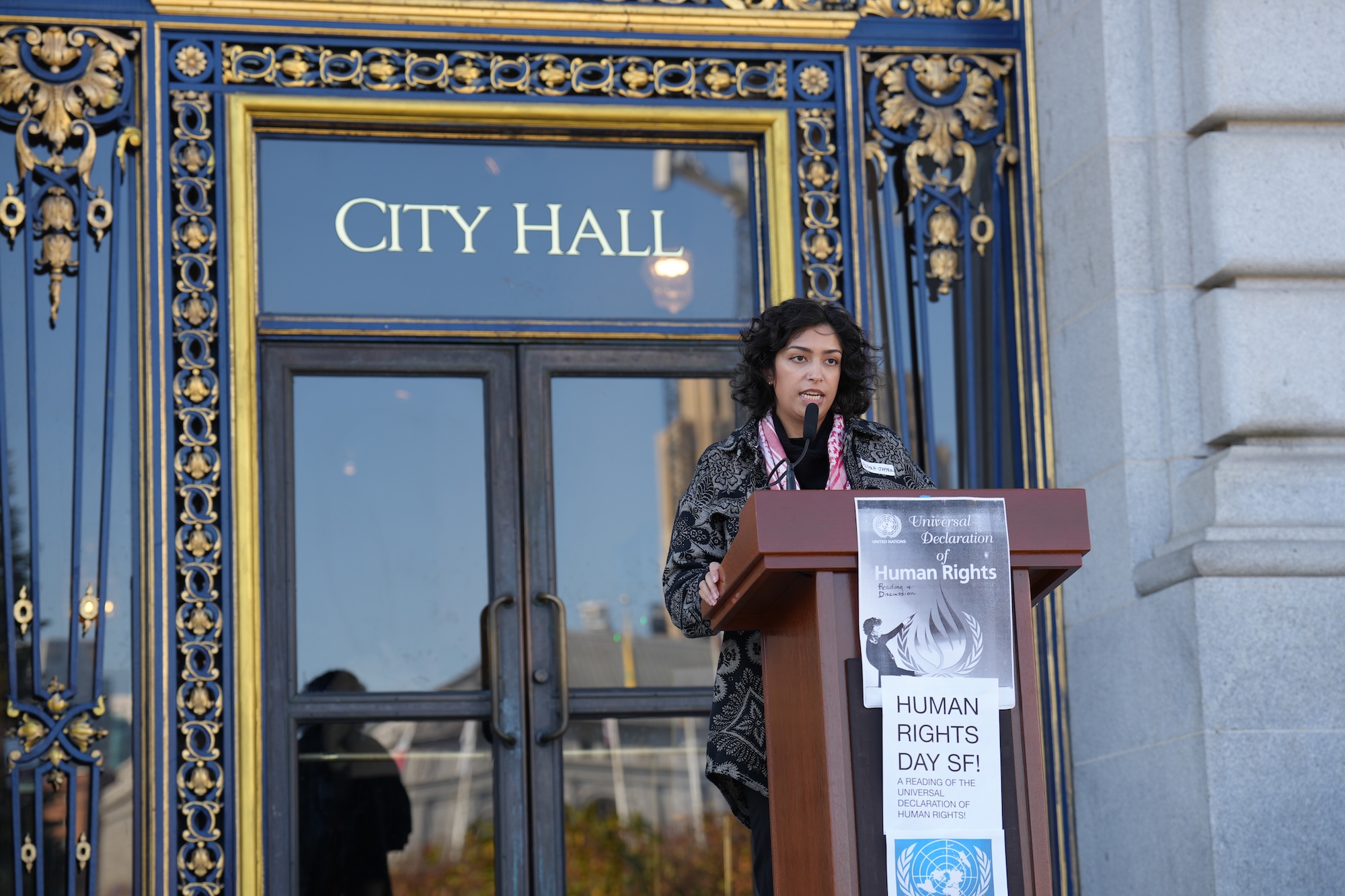 When addressing those assembled, Hene Kelley of the San Francisco Democratic County Central Committee AD 19, related the importance of the role that women played in the creation and establishment of the UDHR through 81 meetings held by a United Nations Committee chaired by Eleanor Roosevelt. She went on to say that the declaration never used “he” or “she” in its entirety thus rendering it generally neutral in making the point that human rights are for all people. Instead, it uses the words “everyone” and “people” throughout its entirety. She characterized the UDHR as “perfect,” going further to reflect, too, that the United Nations “listened to those women.” Her upbeat comments were followed by the reality of Human Rights in today’s world.