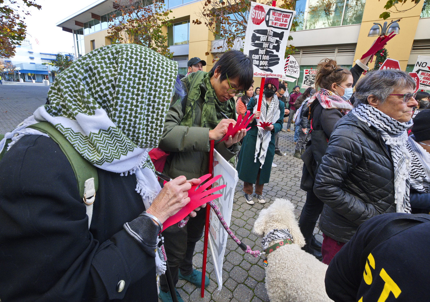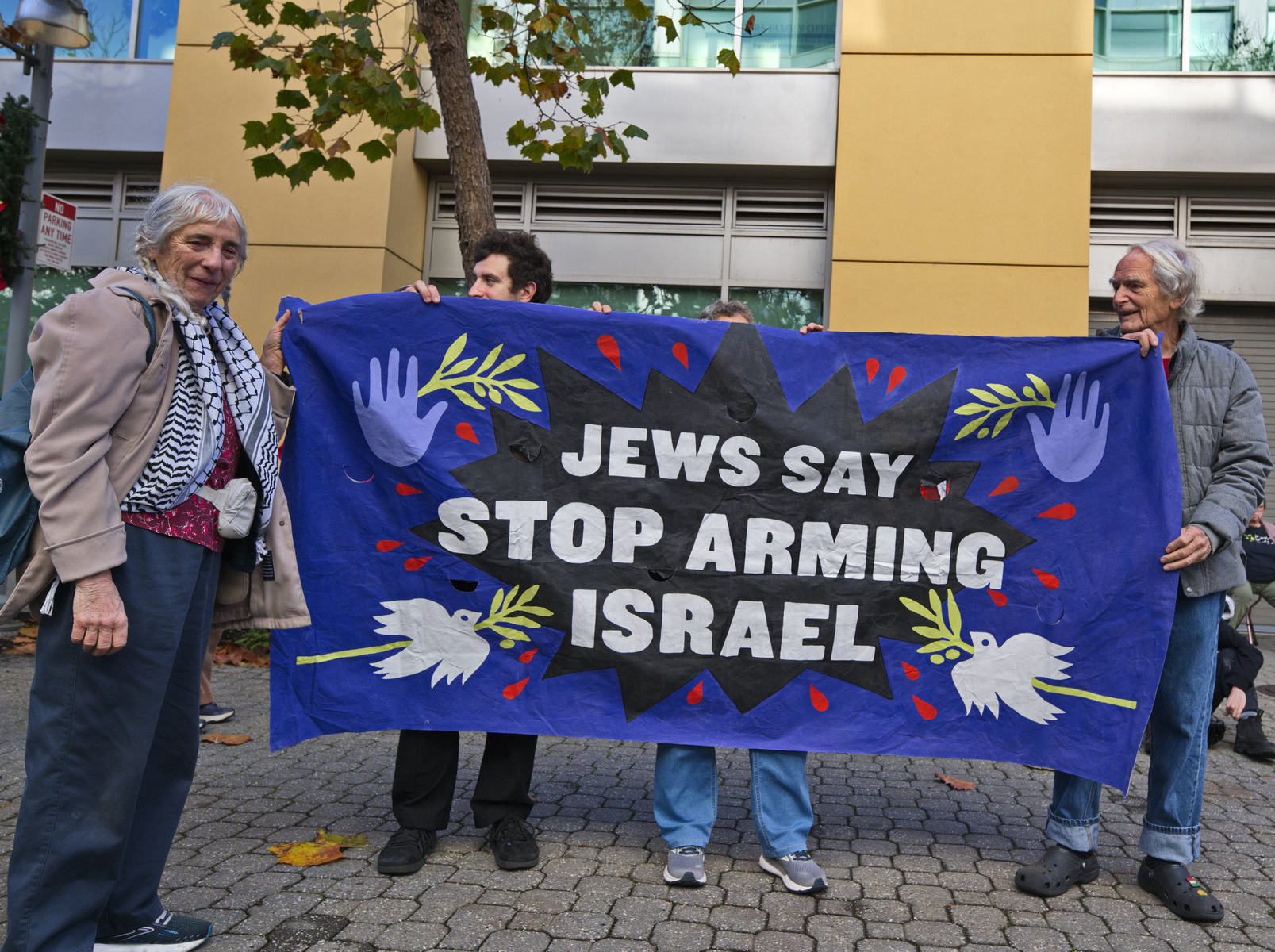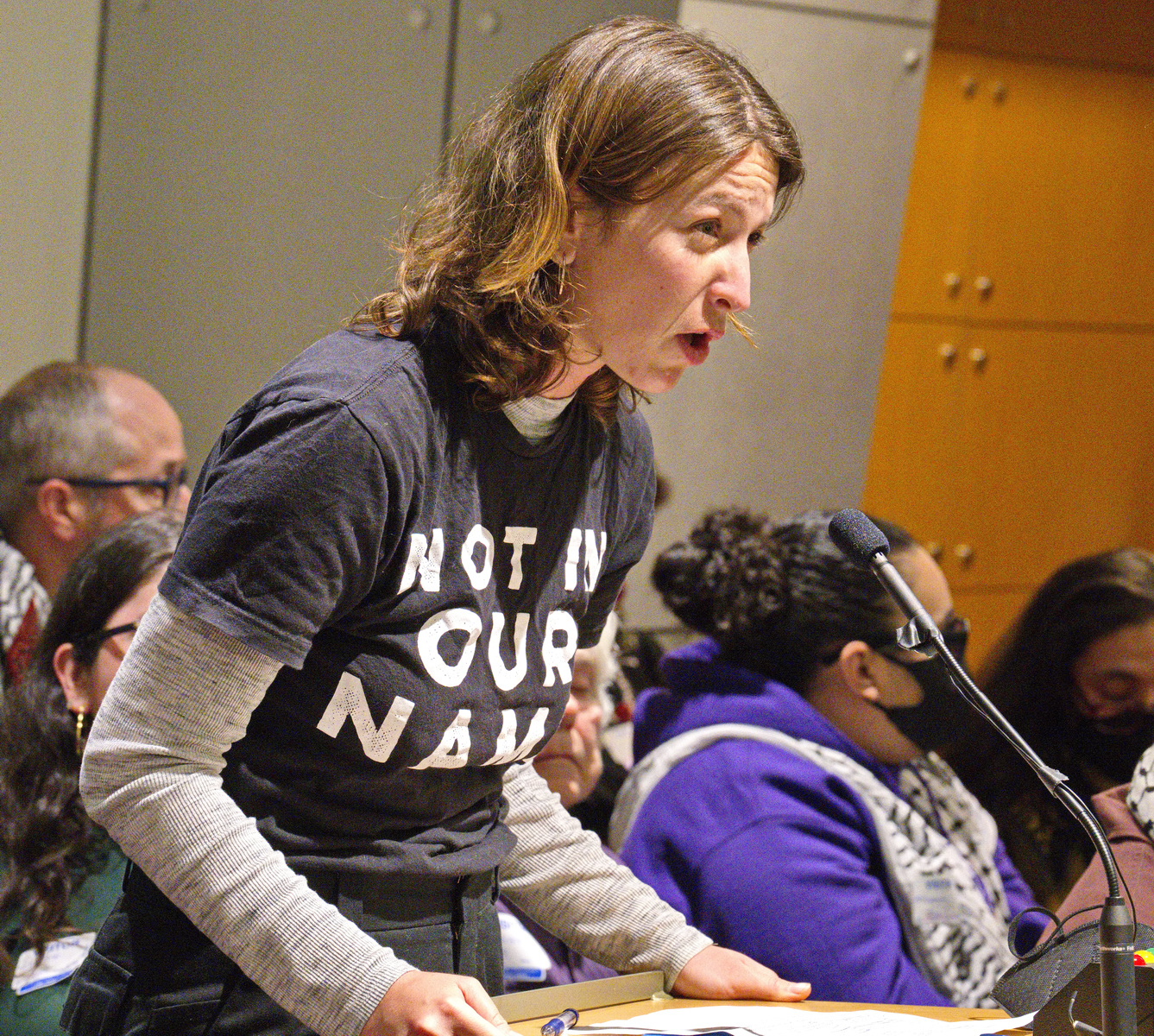 (Oakland, Dec. 18) - The Commissioners in the well-appointed Board Room on the second floor could not have avoided hearing the rally in front. The protest by Jewish Voice for Peace, the Palestinian Youth Movement, AROC (Arab Resource Organizing Committee), California Nurses Association, Arms Embargo Now.org, Bay Internationalists, and others was the biggest yet of the many held at the 30 Water Street Location."Not In Our Name" t-shirts, keffiyehs and Union t-shirts were ubiquitous.