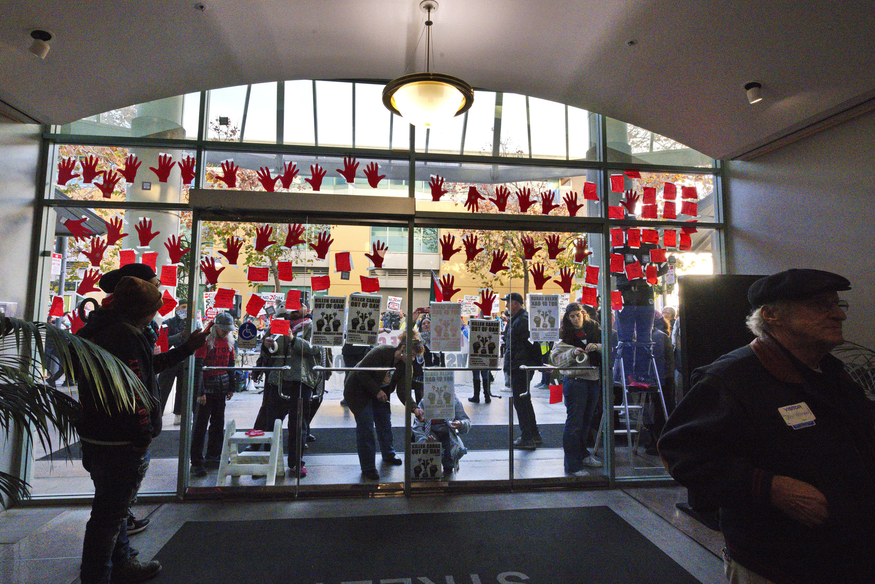 Speakers blasted the use of civilian infrastructure to support Israel's ongoing genocide of Palestine. The demonstrators wrote messages on red, blood colored "hands" that were taped to the building's large front window.