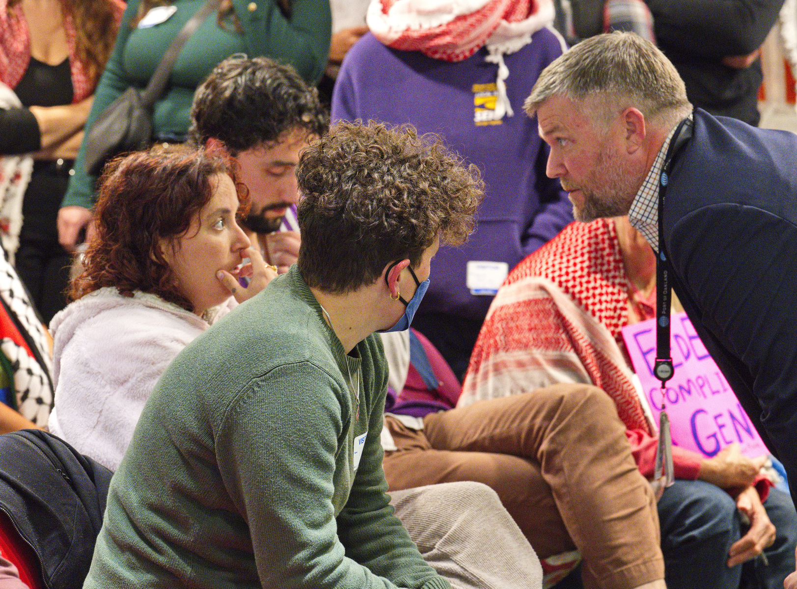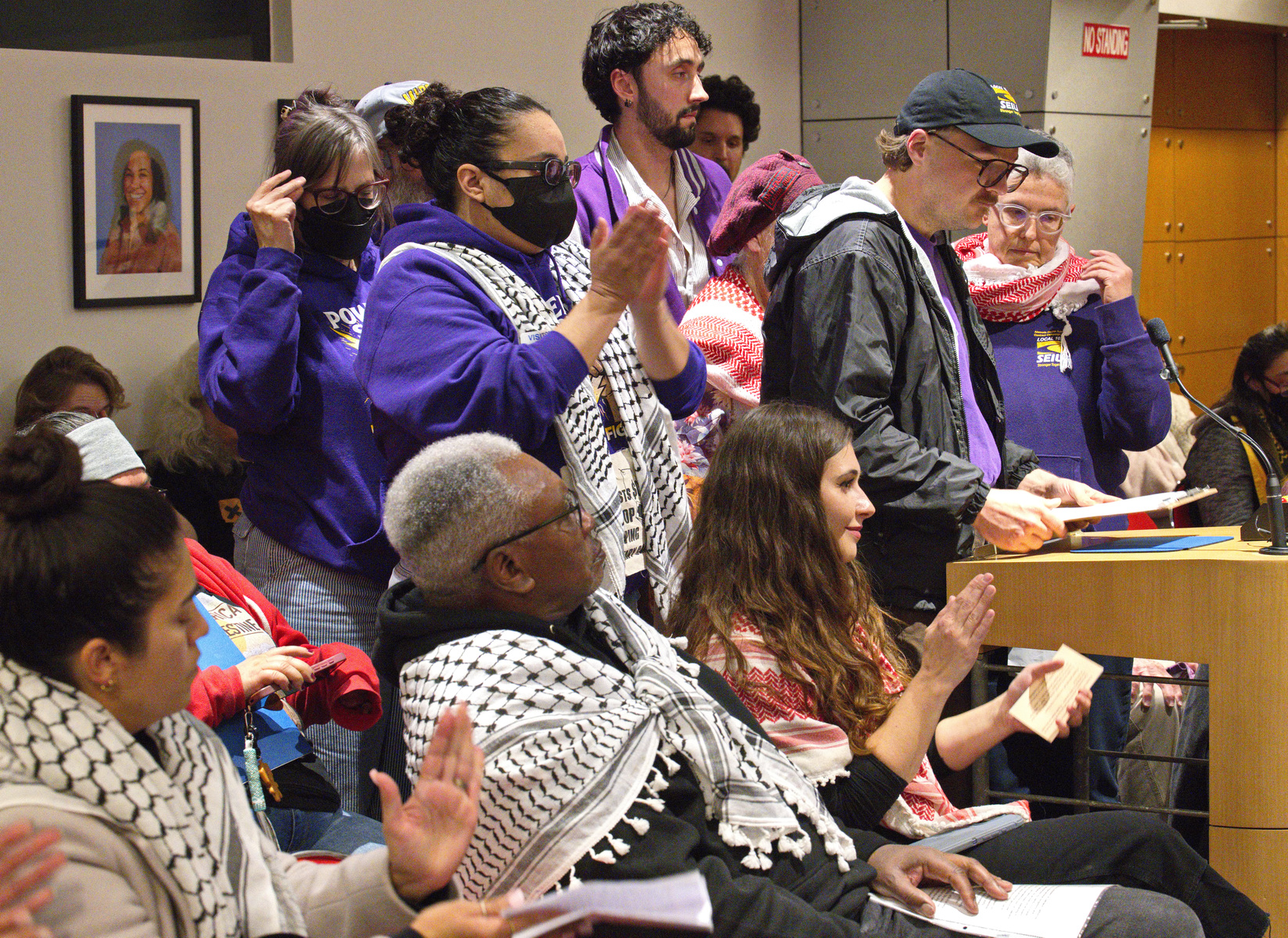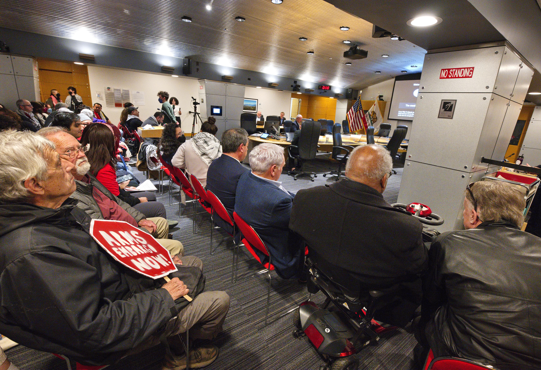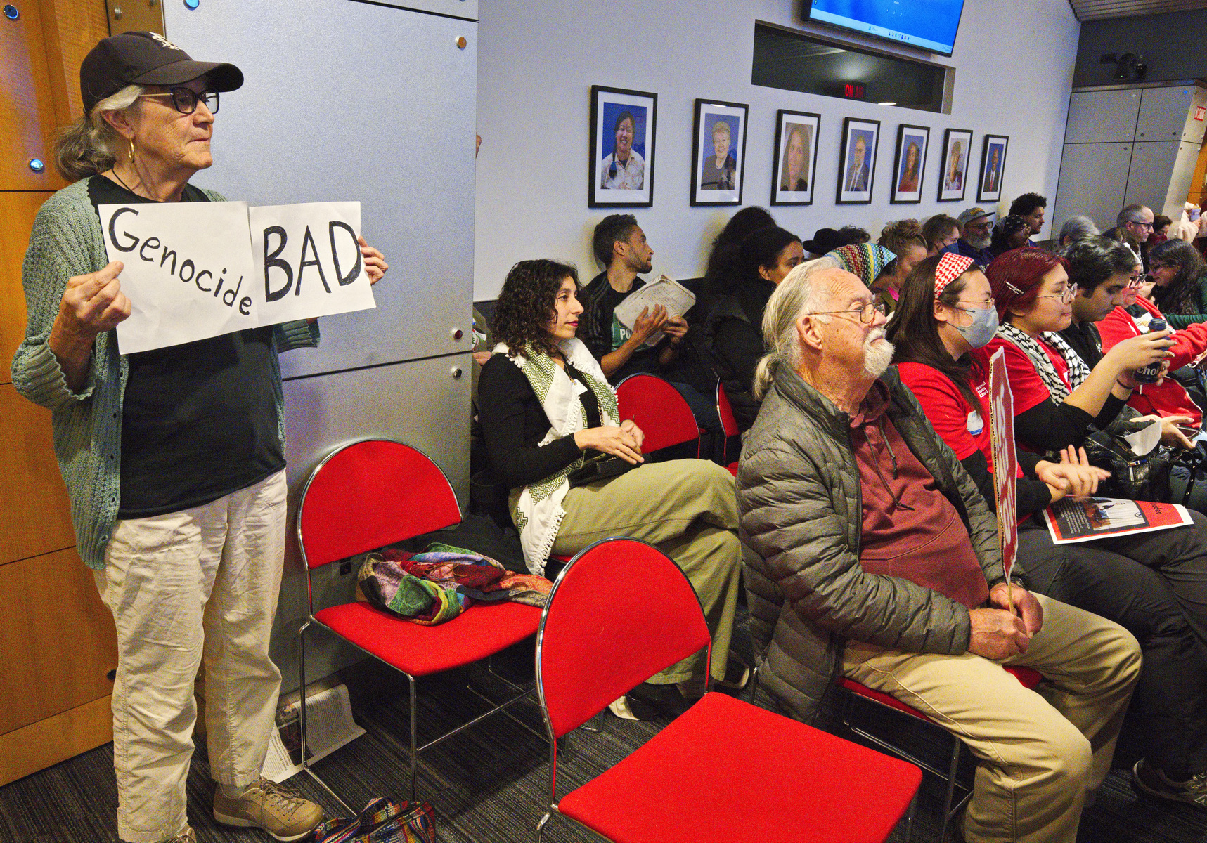 Activists filled all seats in the board's meeting room, requiring the use of the linked overflow facility. Going beyond the allocated hour for public comment, speakers made impassioned pleas to the commissioners to take an ethical stand against the genocide.